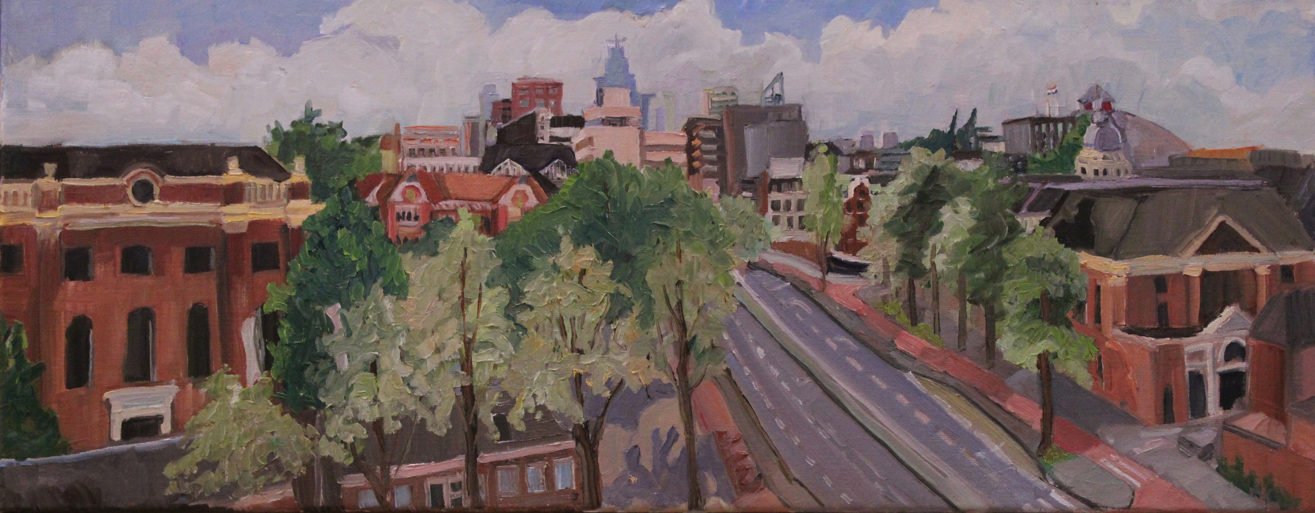 Dit schilderij is in mei/juni vanaf het dak van de Jodenbreestraat plein air gemaakt. Op het schilderij is te zien dat gebouwen van verschillende tijden naast en achter elkaar staan in Amsterdam.