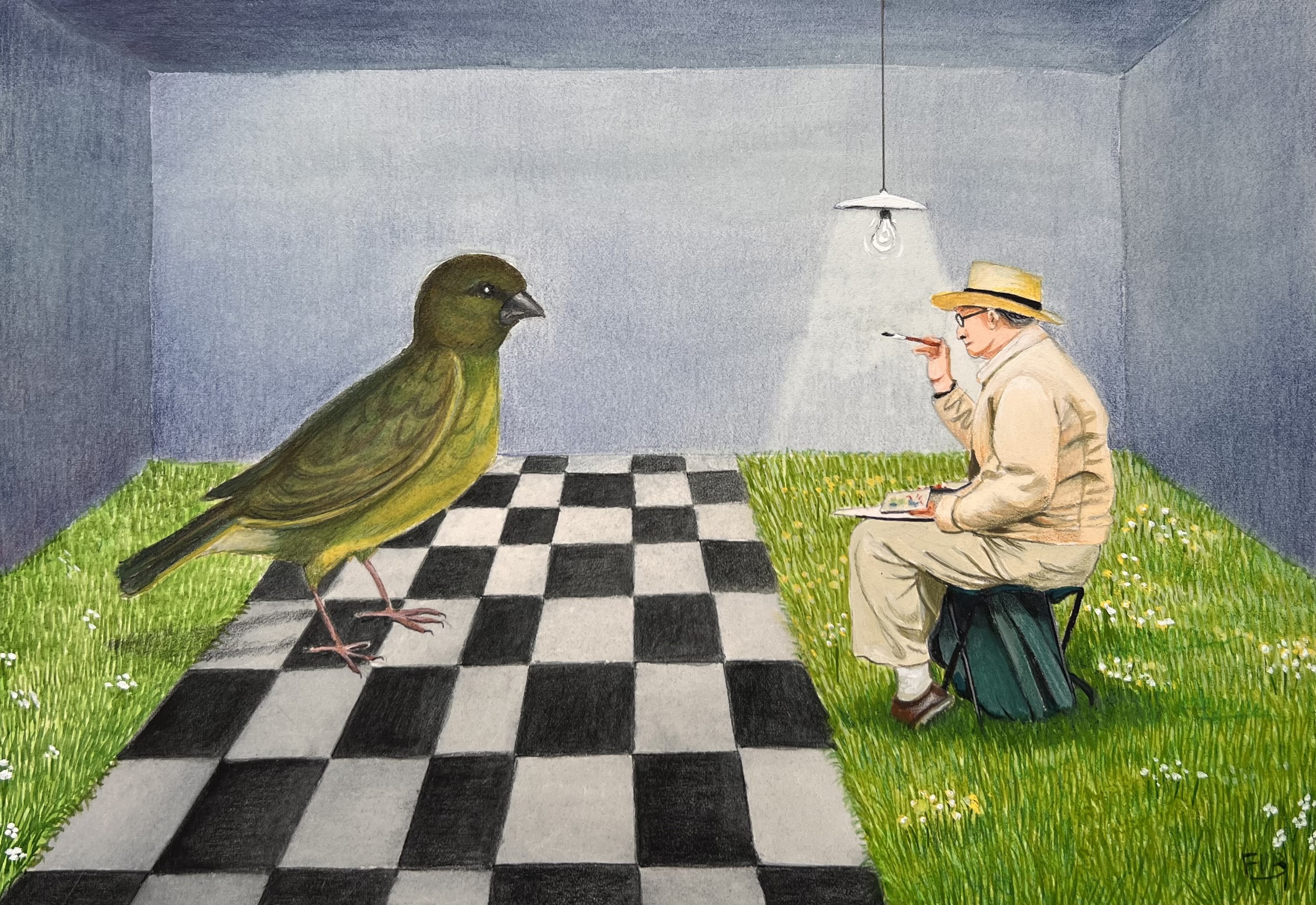 In mijn dromen zag ik een kunstenaar die een vogel in perspectief nam om die vervolgens op het papier uit te tekenen. Het landschap is niets anders dan een kamer en een zwart wit tegelvloer vormt een barriere tussen twee groenpartijen. De gloeilamp verlicht de kunstenaar en staat voor onze innerlijke verlichting.