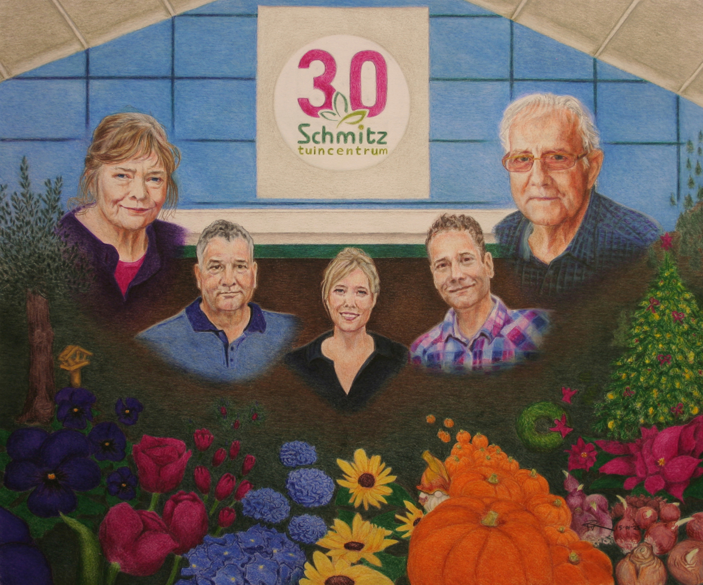 Familieportrettekening omringd door kleurrijke bloemen, planten en bomen welke de seizoenen in het tuincentrum weergeven. In opdracht van alle medewerkers van tuincentrum Schmitz. Ter ere van de viering van het 30 jarig jubileum van het familiebedrijf.