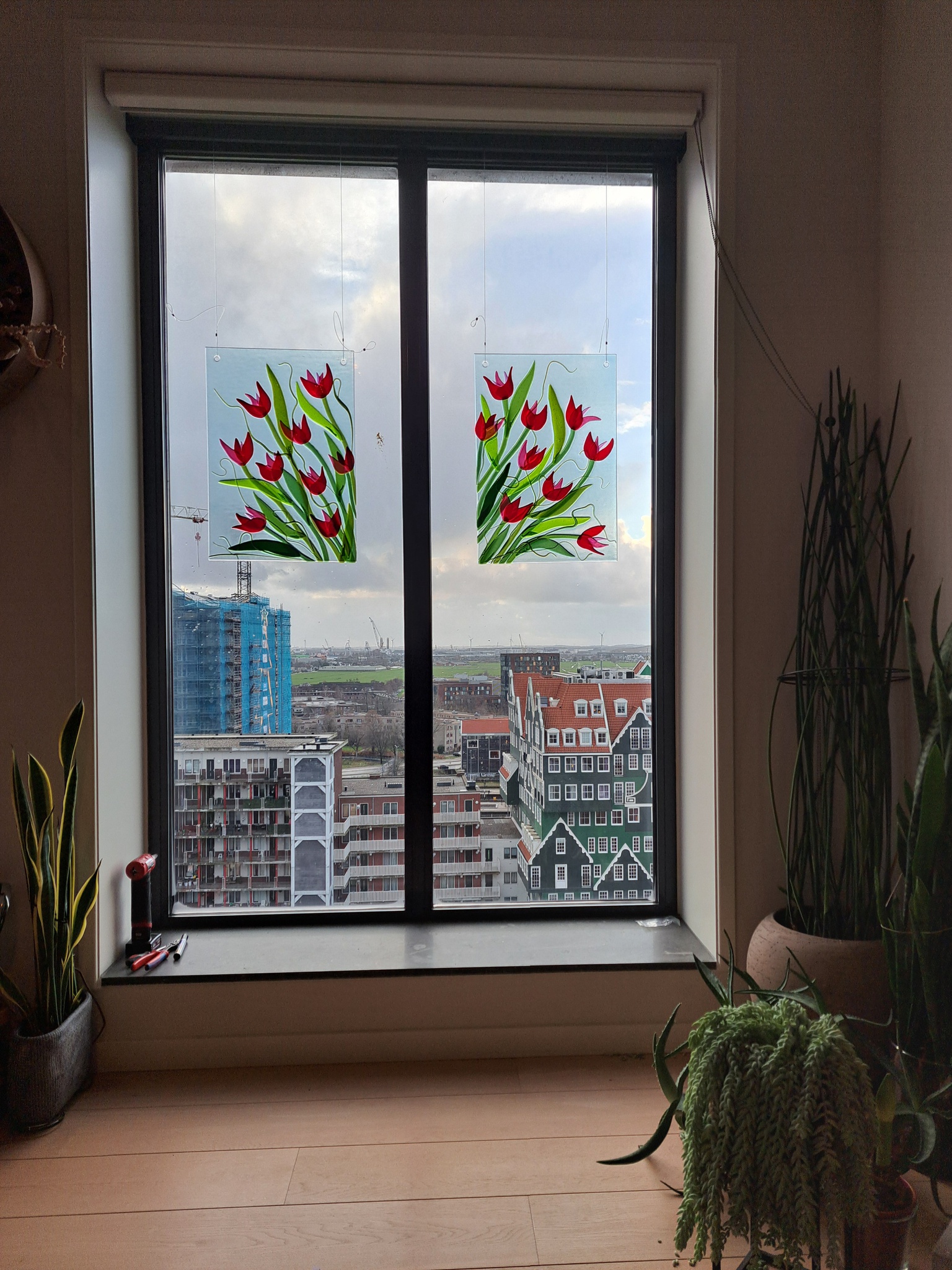 In opdracht gemaakt: 2 gefusede hangende glaspanelen voor in het venster. In samenwerking me Anke Marth Jurg.