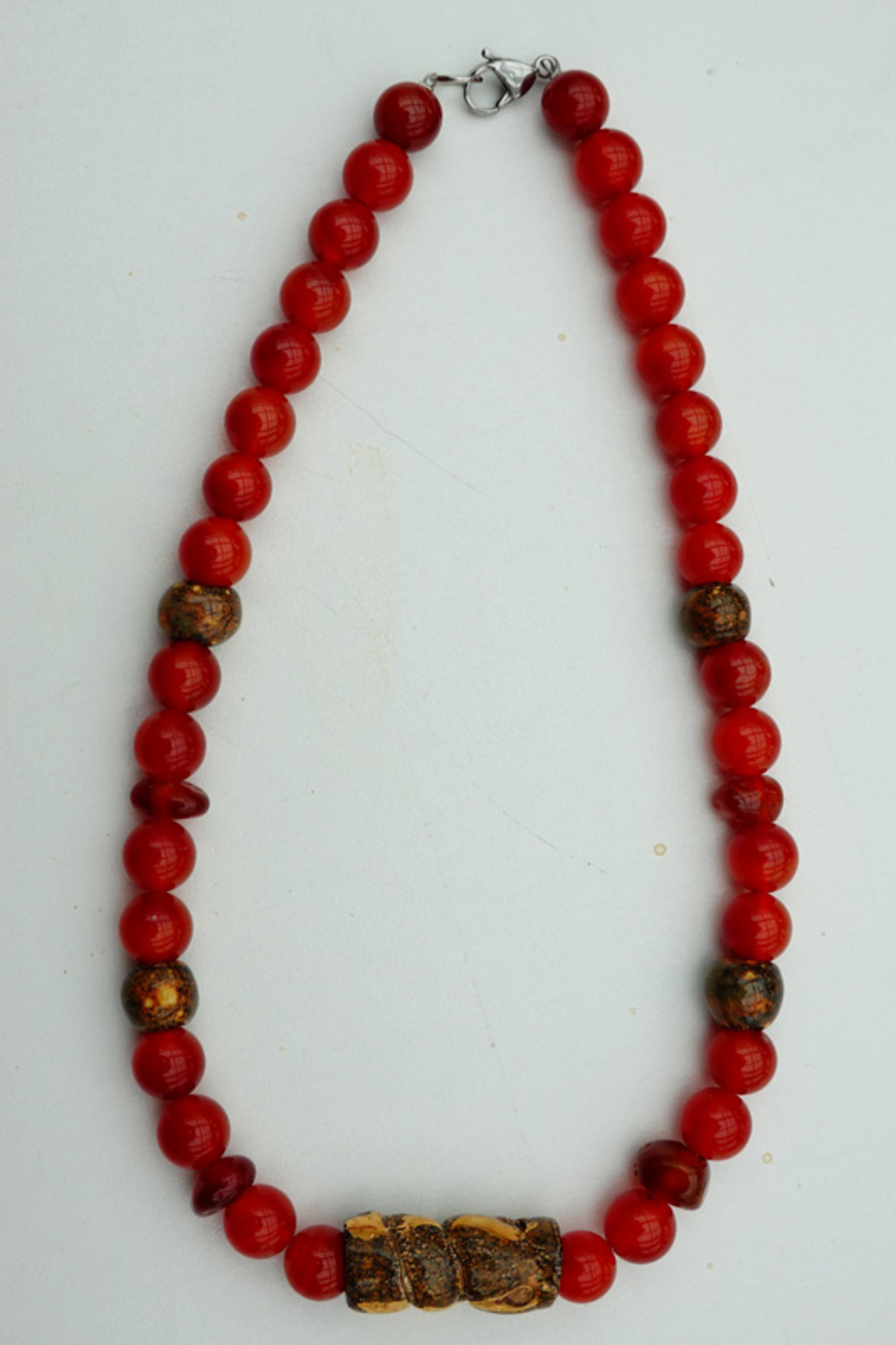 Collier met kralen van keramiek met goud en carneool (half edelsteen). Voorbeeld voor mijn colliers met keramiek en andere halfedelstenen