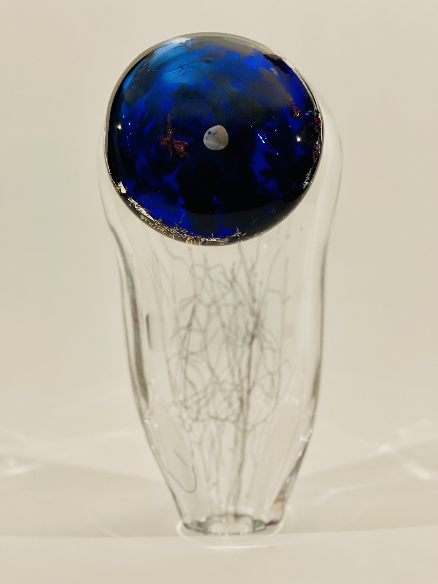 2 geblazen glasobjectern ineen. de grote is blank glas de kleine koningsblauw.
