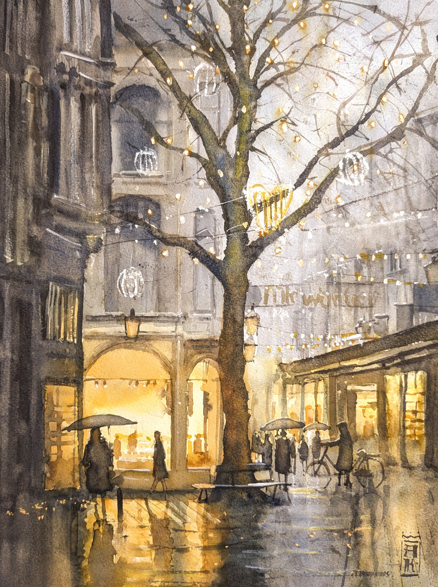 Schilderij Aquarel Realistisch Painting Winter Regen Watercolor Stad Stadsgezicht Straat City Street Utrecht Rain Cityscape