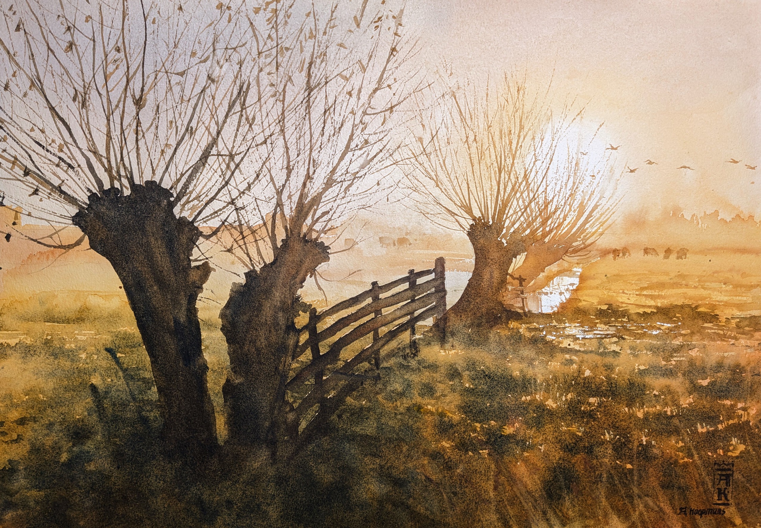 Schilderij Landschap Aquarel Realistisch Natuur Painting Bomen Polder Winter Weiland Watercolor Mist Mistig Trees Countryside Knotwilgen Platteland