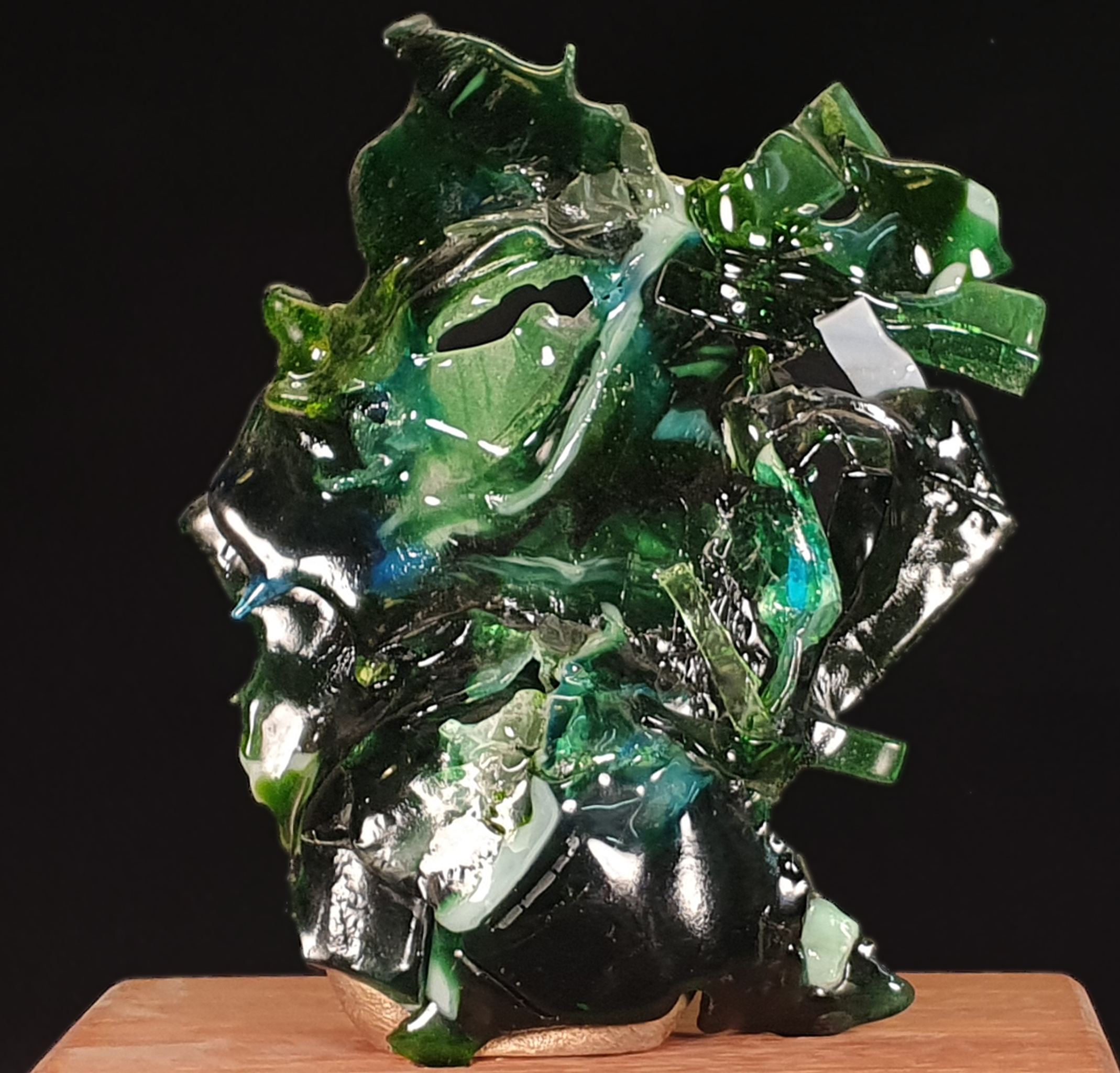 In dit werk heb ik geprobeerd de zon te vangen in de contrasten tussen glas, brons en hout. Het brons - een donutvorm - vormt een stevige, solide basis. Het glas is als een gordijn om het brons 'gedrapeerd'. Glas en brons worden zelden in combinatie gezien, vooral vanwege de technische uitdagingen van het combineren van deze prachtige materialen. Deze unieke blikvanger is gemonteerd op recycled hout.