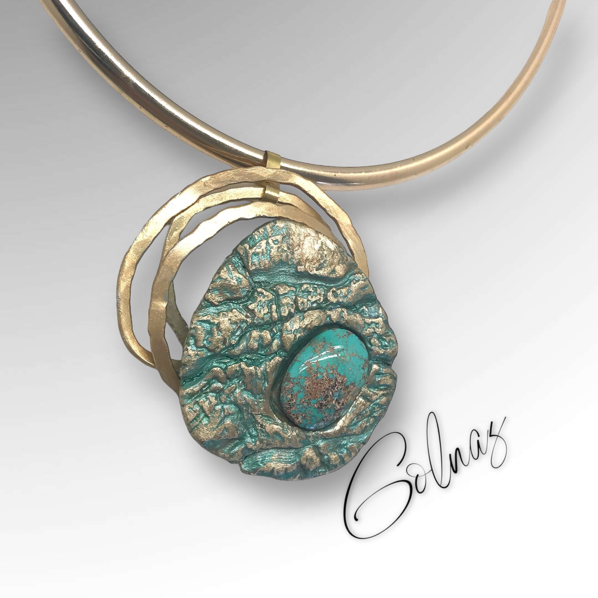 Bronzen hanger met een turquoise steen hangt op een metal vergulde choker ketting.