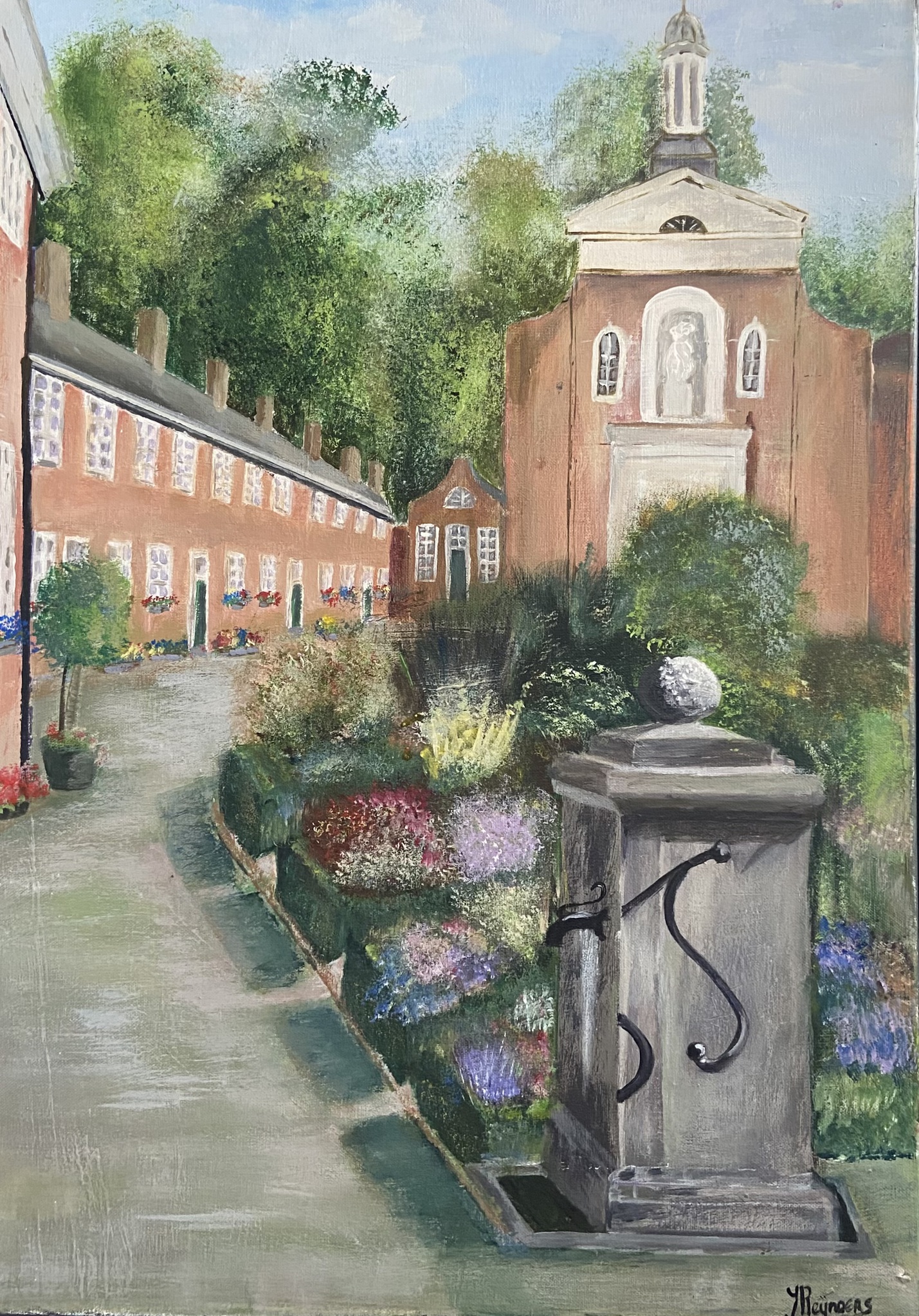 Begijnhof Breda in de zomer, en plein air geschilderd in acryl.
