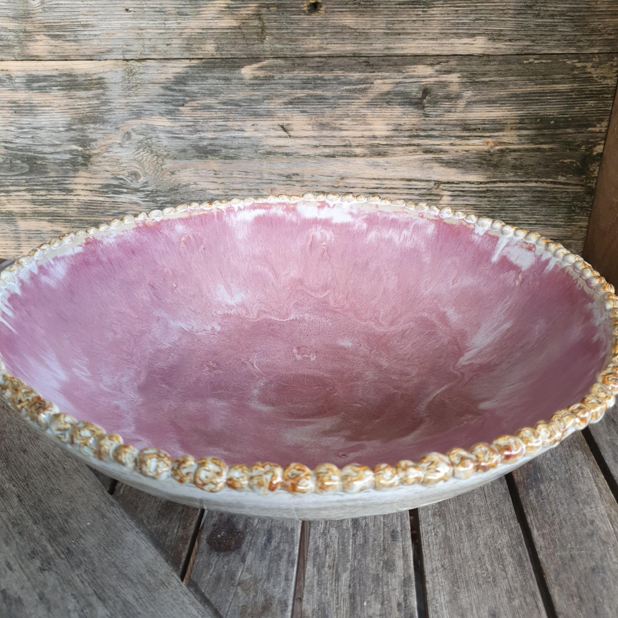 Grote Ronde Schaal Binnen Buiten Meerkleurig Roze Crème Sgraffito