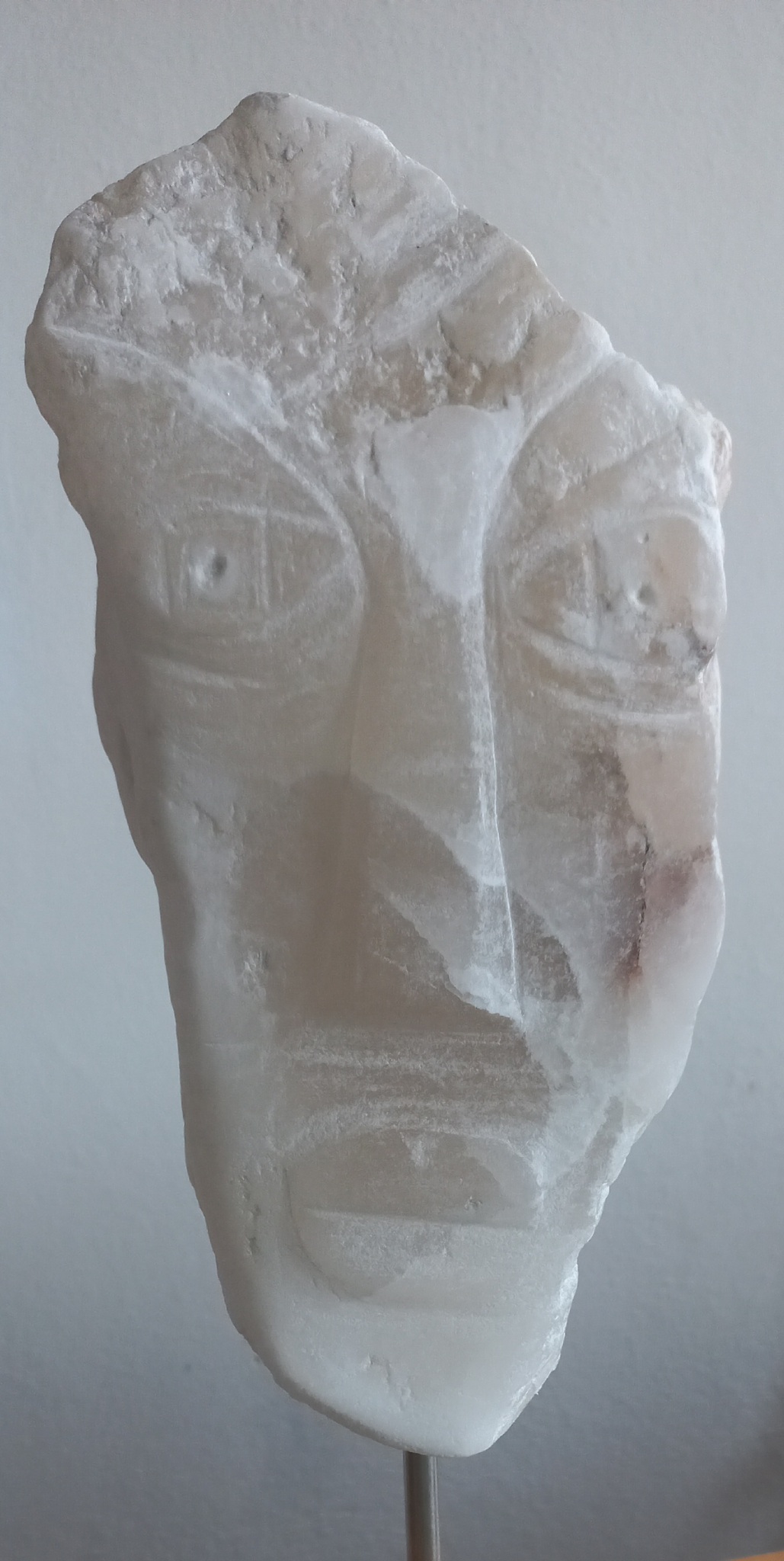 Kop van albast op sokkel met plexiglas voet. Te zien bij Galerie Tijd voor Kunst in Oegstgeest tot 23 april