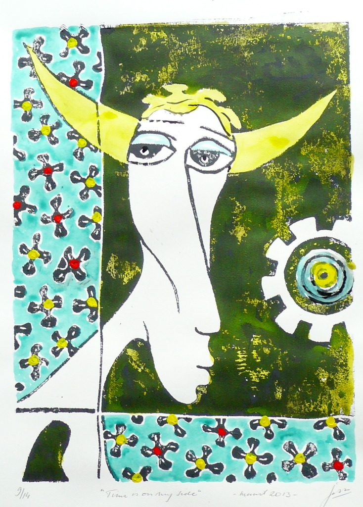 Lino-druk, handbeschilderd over voortschrijdende tijd