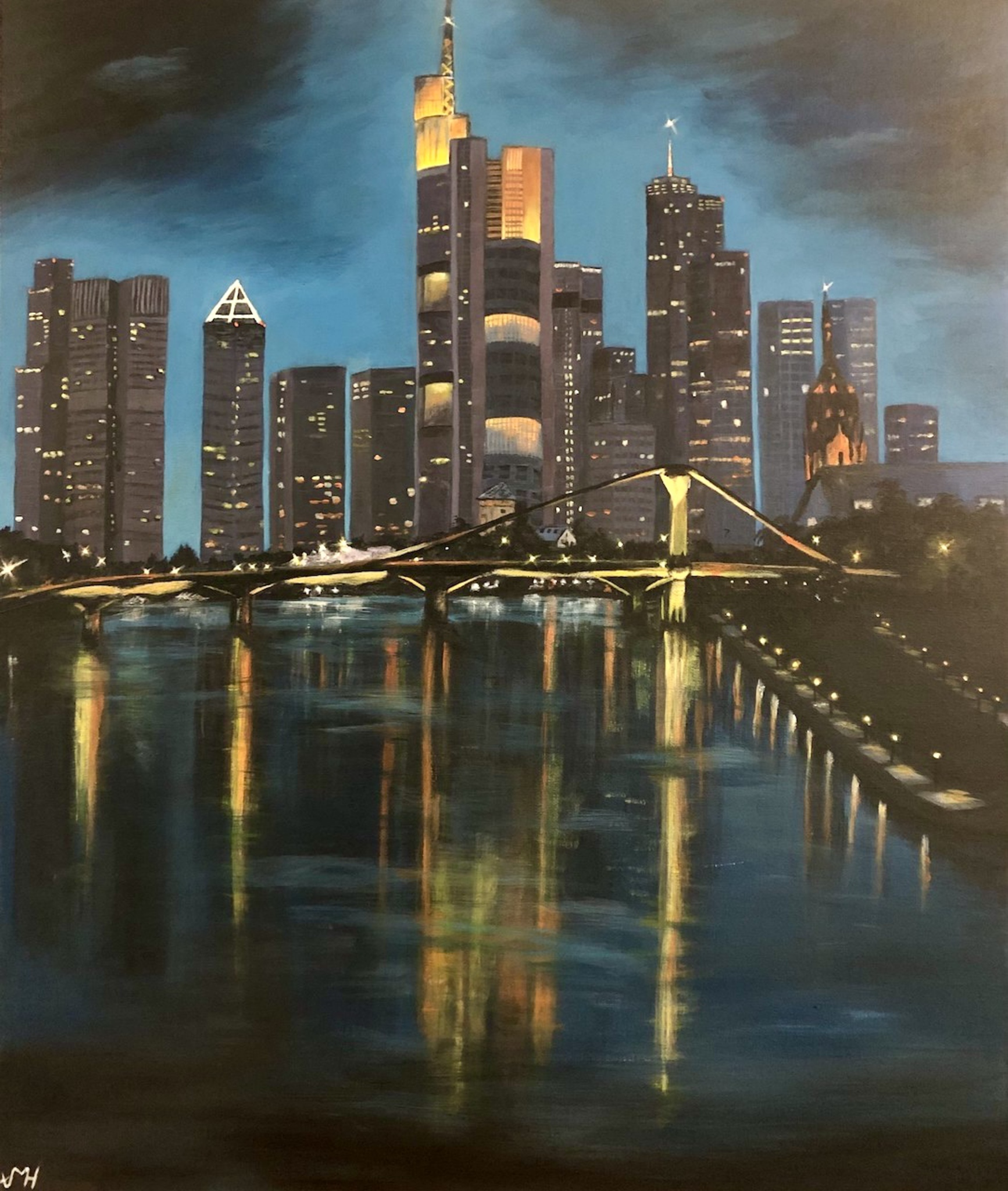 De indrukwekkende skyline van Frankfurt straalt in het avondlicht. De warme gloed van de gebouwen reflecteert in de rivier, terwijl de stad tot leven komt in een spel van licht en schaduw. VERKOCHT