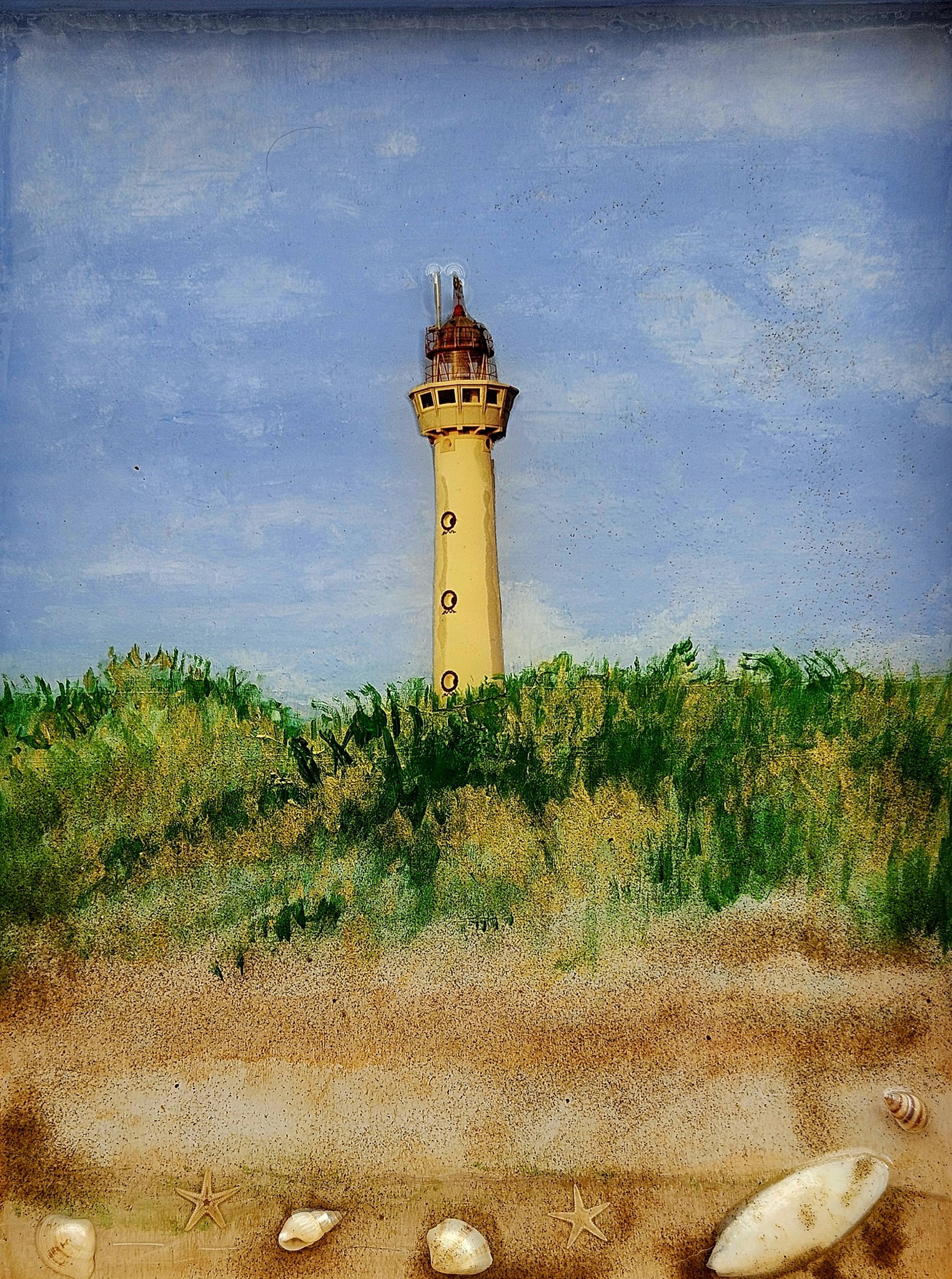 De Van Speyk is een imposante vuurtoren in Egmond aan zee. het schilderij is geschilderd met acrylverf en ingegoten met epoxy. Het zand, en de schelpen komen van het strand van Egmond.