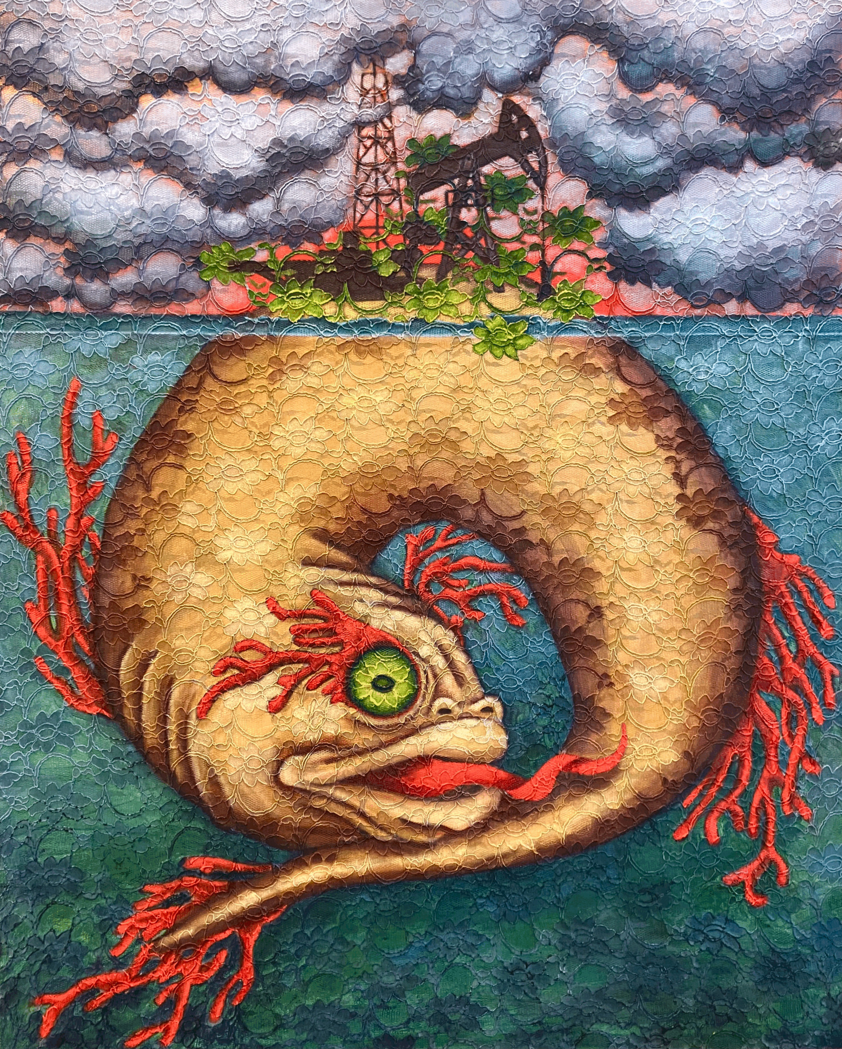 Jasconius is een vis, waarvan het verhaal stamt uit de Romaanse mythologie, legende en folklore. Het meest opvallende aan Jasconius is haar enorme omvang. Drijvend in het water lijkt haar rug een eiland. Sommige verhalen over haar vermelden zelfs een bos, strand en kleine rivier. Door haar verschijning lokt zij zeelieden, maar zodra deze een vuur aansteken duikt zij onder en doodt de zeelieden op deze manier. Voor mij staat Jasconius voor onze aarde en de fossiele industrie voor het vuur van de zeelieden. Hoe lang duurt het nog voordat Jasconius die pijn voelt en voor altijd onderduikt. Of kunnen wij dat tij nog keren?