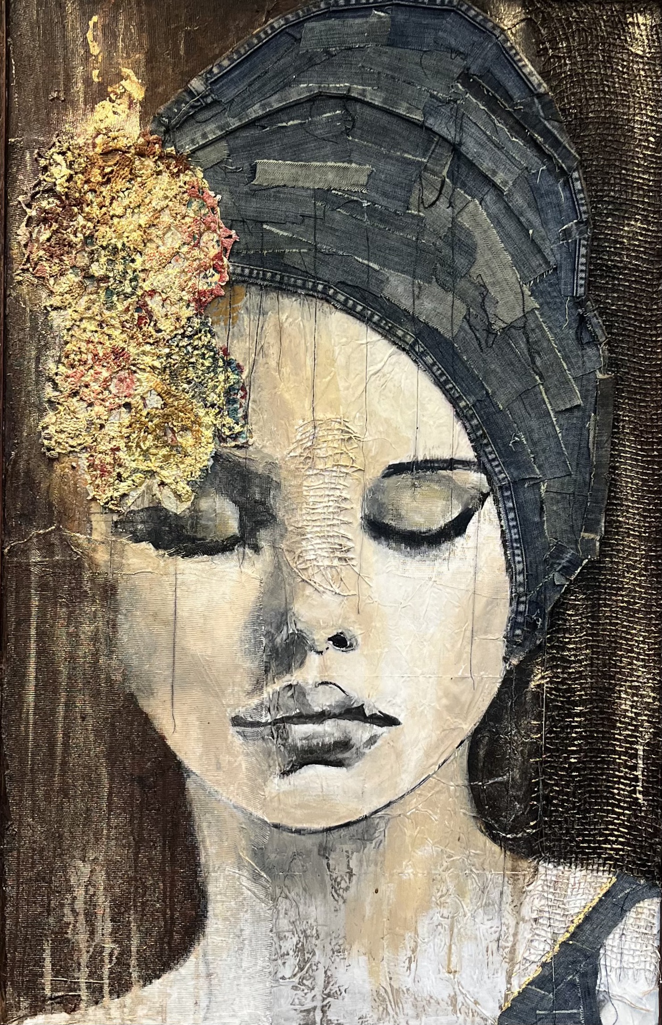 Portret in Acryl met structuur, stof, koffie en goudfolie