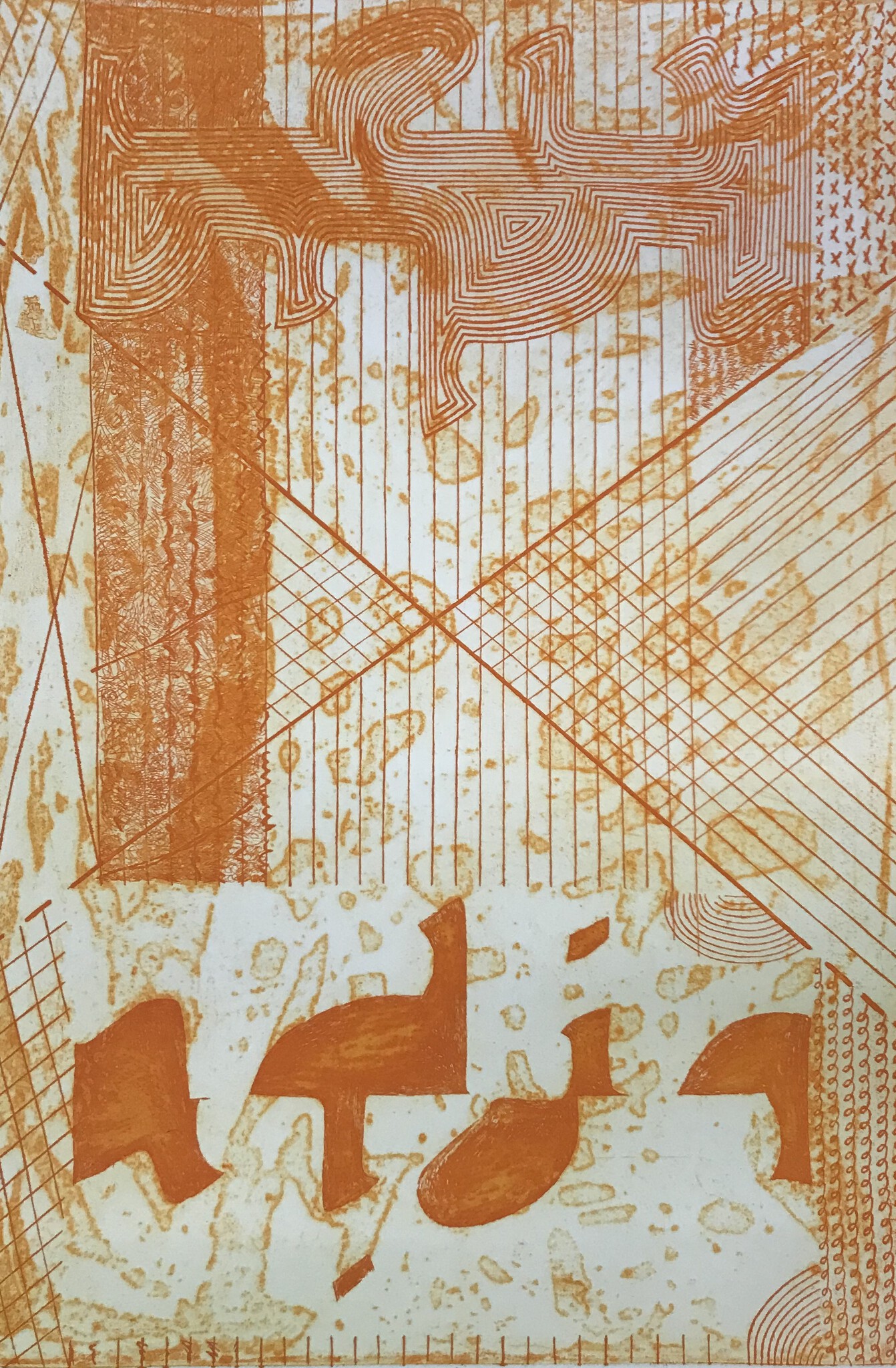 Josée Wuyts laat in deze prent de ritmes en structuren een dialoog aangaan met schijnbaar toevallig ontstane amorfe vormen. De kleur variëert van intens oranje naar transparant geel.