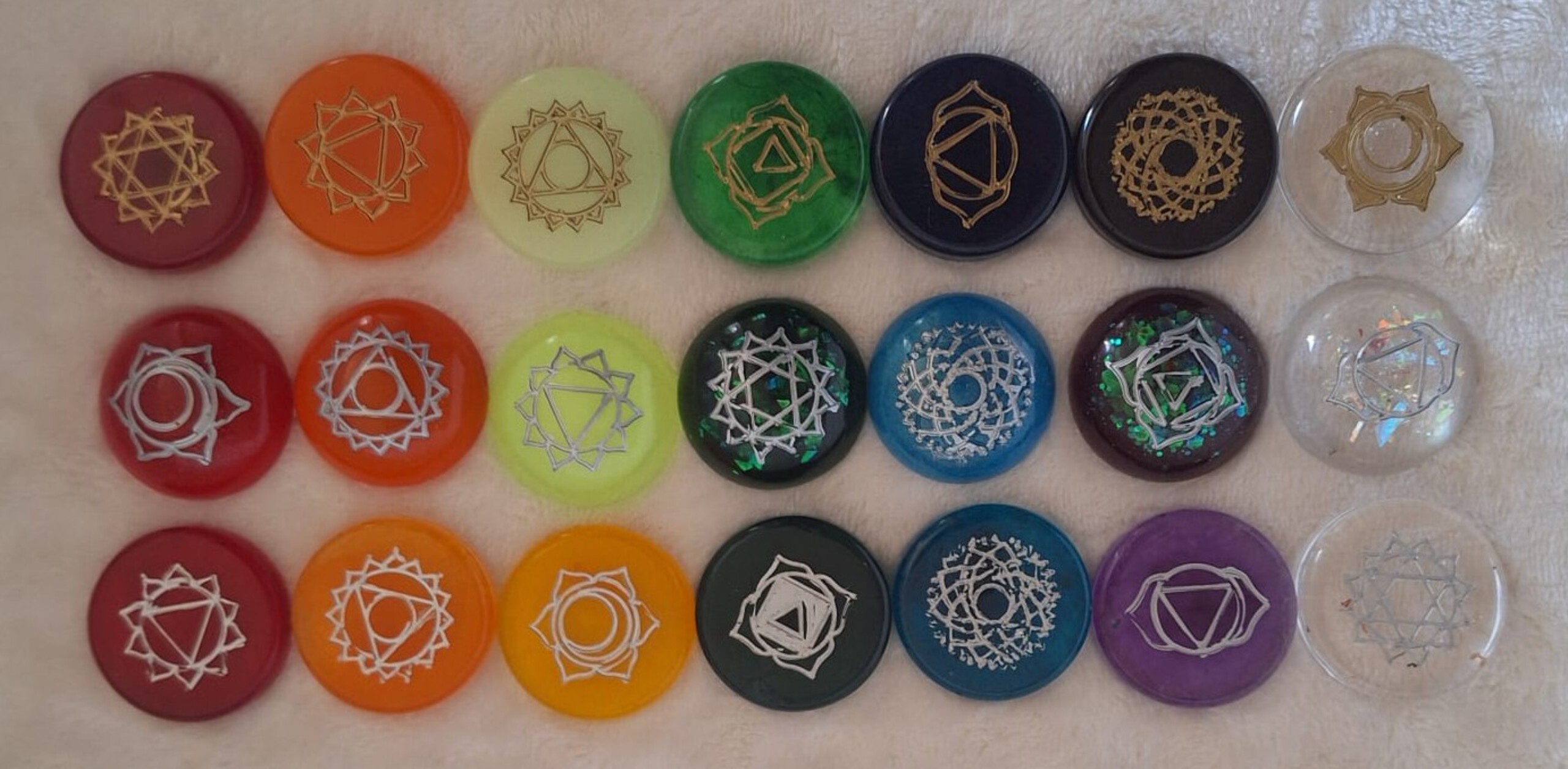 Stenen in de chakra kleuren; bol of plat. Ze zijn niet allemaal hetzelfde qua grootte / hoogte / dikte omdat de hars soms een eigen "willetje" heeft. De afmetingen komen grotendeels overeen, maar kunnen soms iets afwijken.
