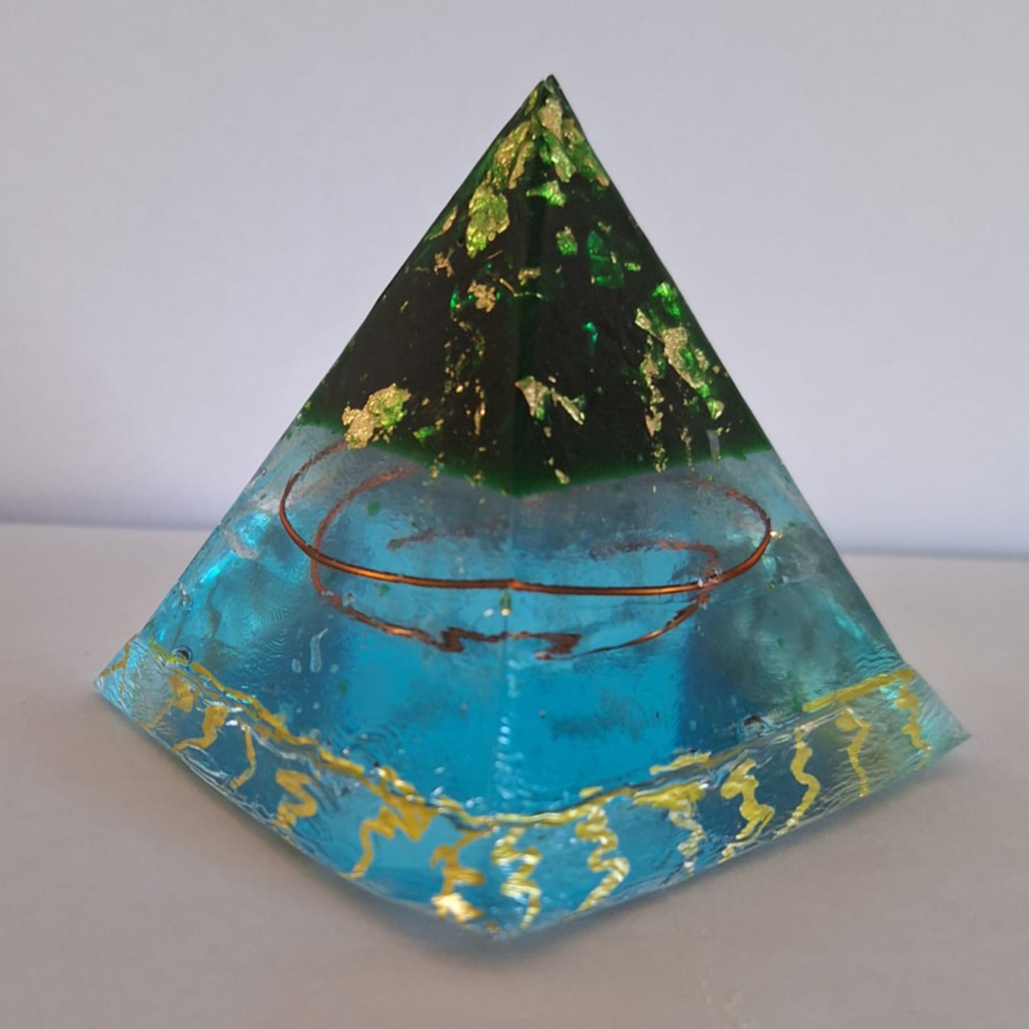 Orgonite / piramide met donkergroen, blauw, koperdraad en bladgoud