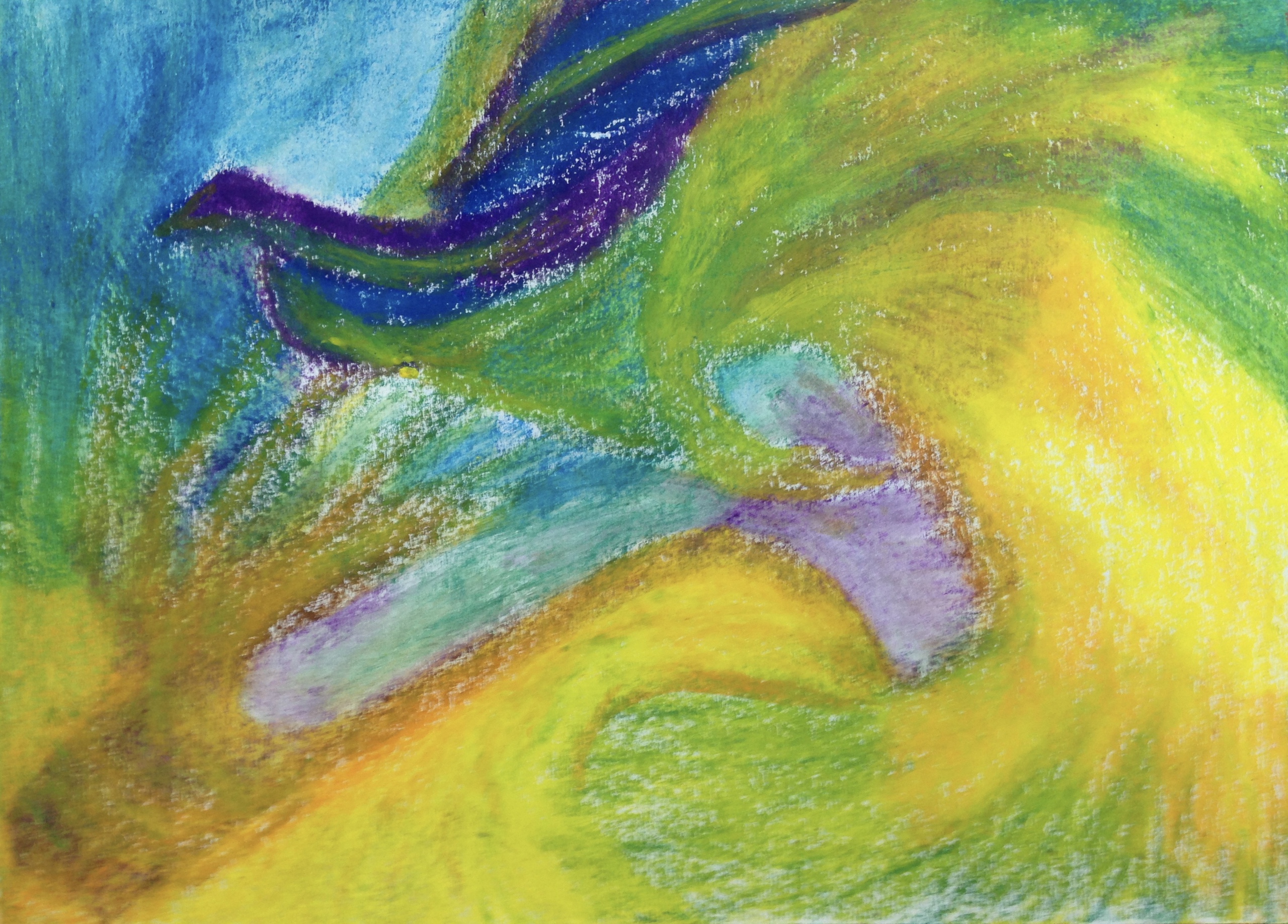 Abstract Oranje Geel Landschap Blauw Vogel Oker Paars Groen Tekening Bergen Pastelkrijt Lila Rivier Symbolisch Bossen Velden