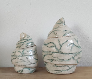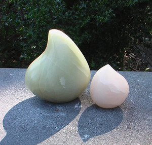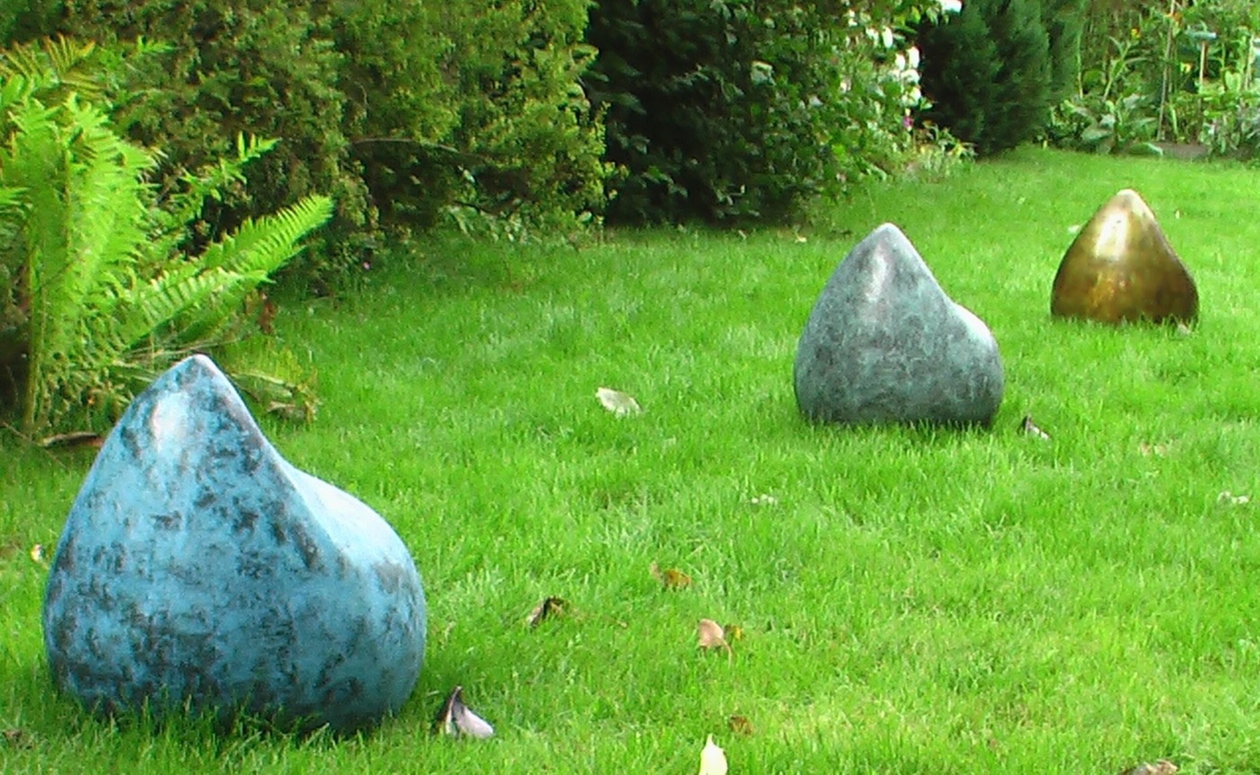 Bronzen Druppels, bruin, blauw en groen gepatineerd, een kleine en een grote horen bij elkaar. - Gewicht: 25 kg Oplage: gegoten 6 exemplaren, nog 3 te koop Prijs: op aanvraag. Gemaakt in: Apeldoorn, 2002 Opmerkingen: Deze druppels zijn speelse beelden door de vormgeving met hol en bol en groot en klein en ze hebben een sierlijke beweging naar de omhoog gaande punt. Het water kan er omheen en vanaf kan vloeien, maar tegelijkertijd staat het als bronzen beeld. Vooral de combinatie met meer druppels en grote en kleine druppels heeft een speels effect. Aankopen van 1 grote + 1 kleine druppel kan of meerdere exemplaren. Maar 1 grote en 1 kleine horen bij elkaar.
