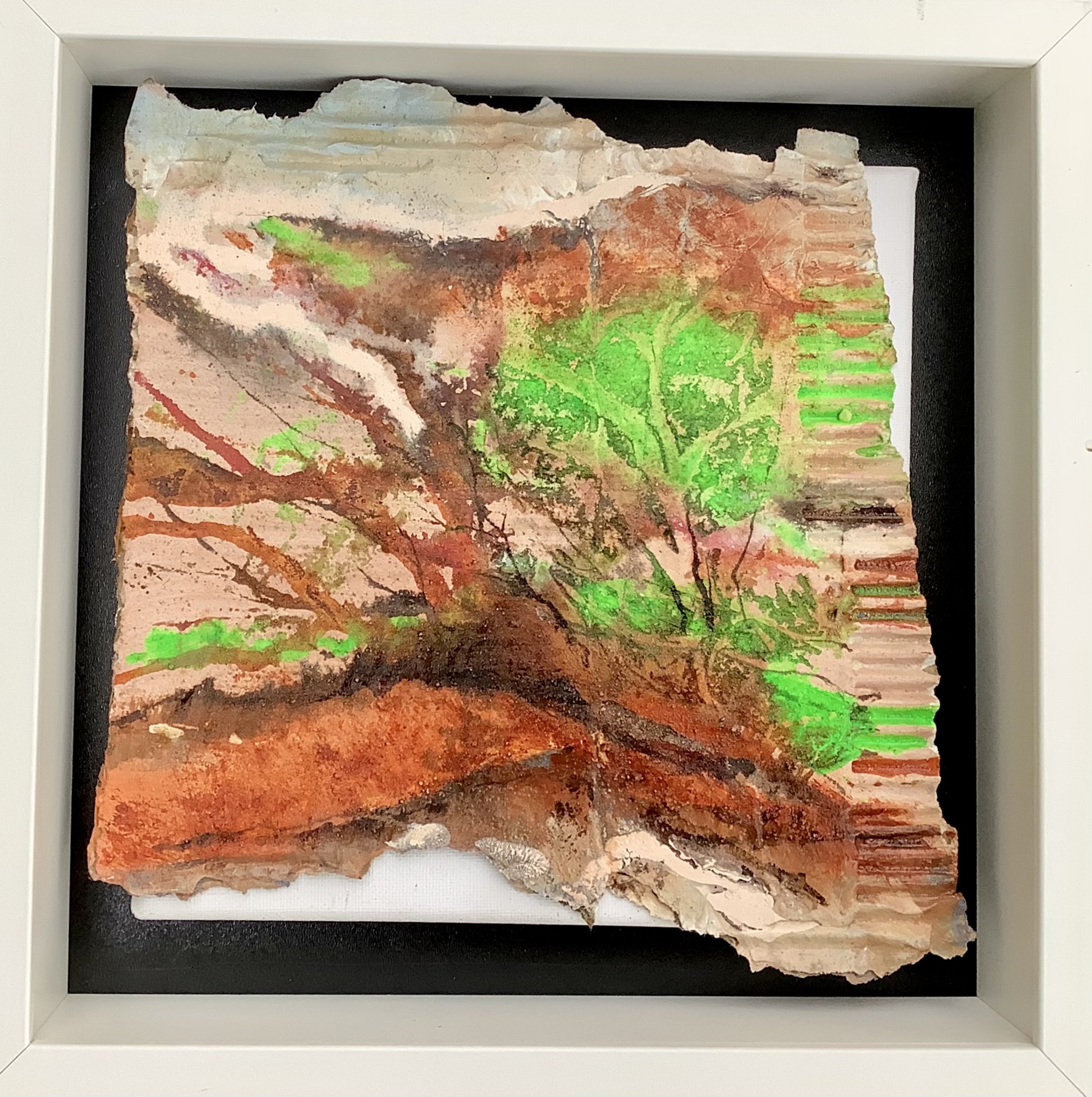 Klein schilderijtje op grillig gevormde ondergrond in kistje. De grillige vormen van de bovenkant zie je weerspiegeld in de vorm van het schilderij. Je ziet boomwortels en allerlei takken.
