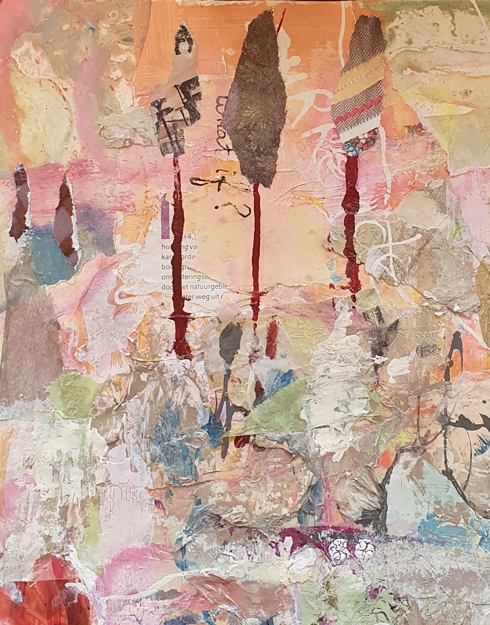 Ik ben Hanneke en heb 23 jaar in de Belgische Ardennen gewoond, waar ik een eigen mozaïek-atelier had. Toen ik in 2012 terugkwam naar Amsterdam, ben ik overgegaan op een andere creatieve werkvorm, met papier, verf, inkt en krijt, waarbij ik op een intuïtieve manier begin te experimenteren zonder te weten waar ik uitkom. Het gaat evenzeer om het proces en het plezier als om het uiteindelijke resultaat.