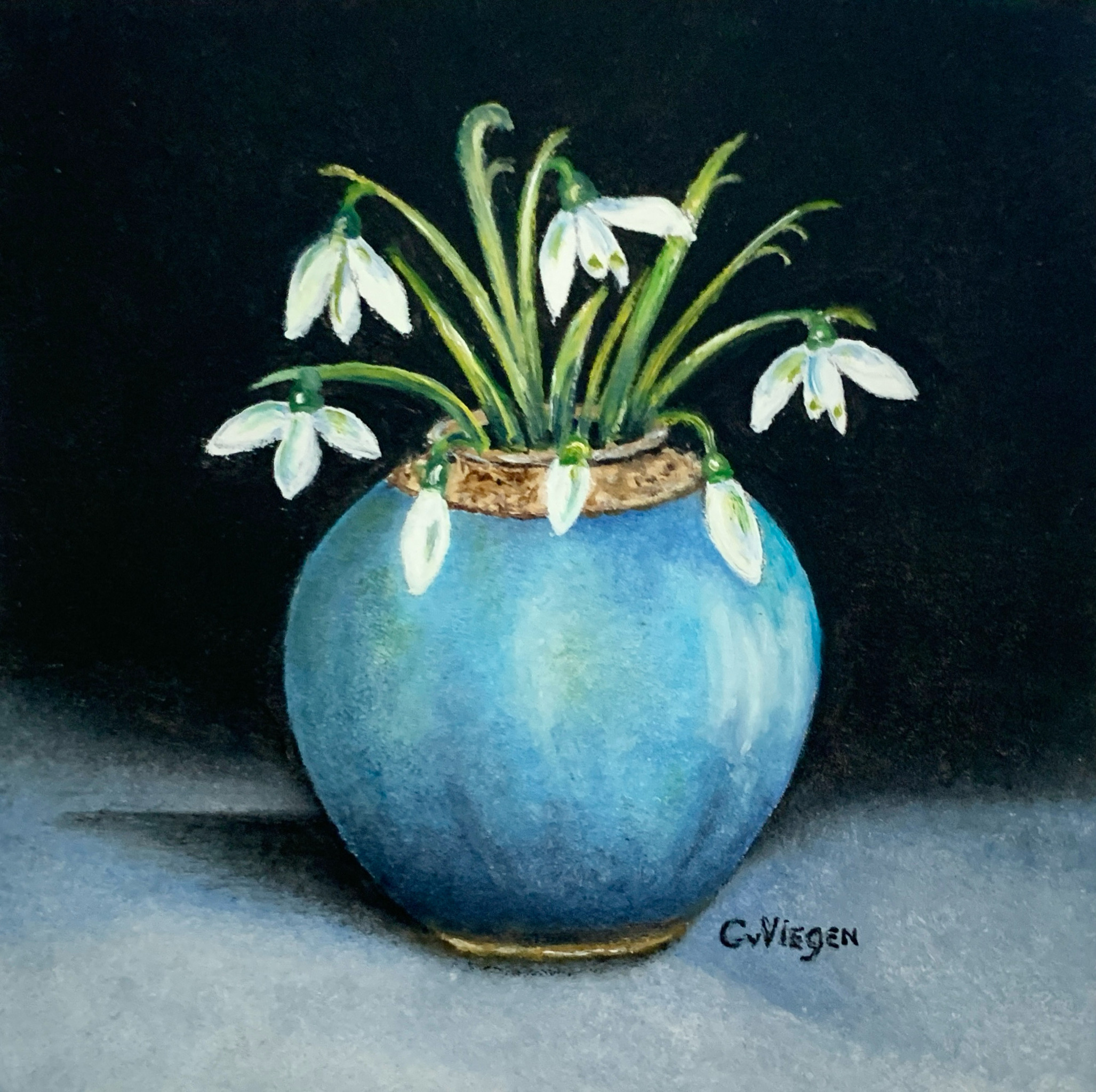 Sneeuwklokjes Snowdrops Potje Vaasje Olieverf Stilleven Paneel Realistisch Natuur Bloemen Voorjaar Blauw Wit