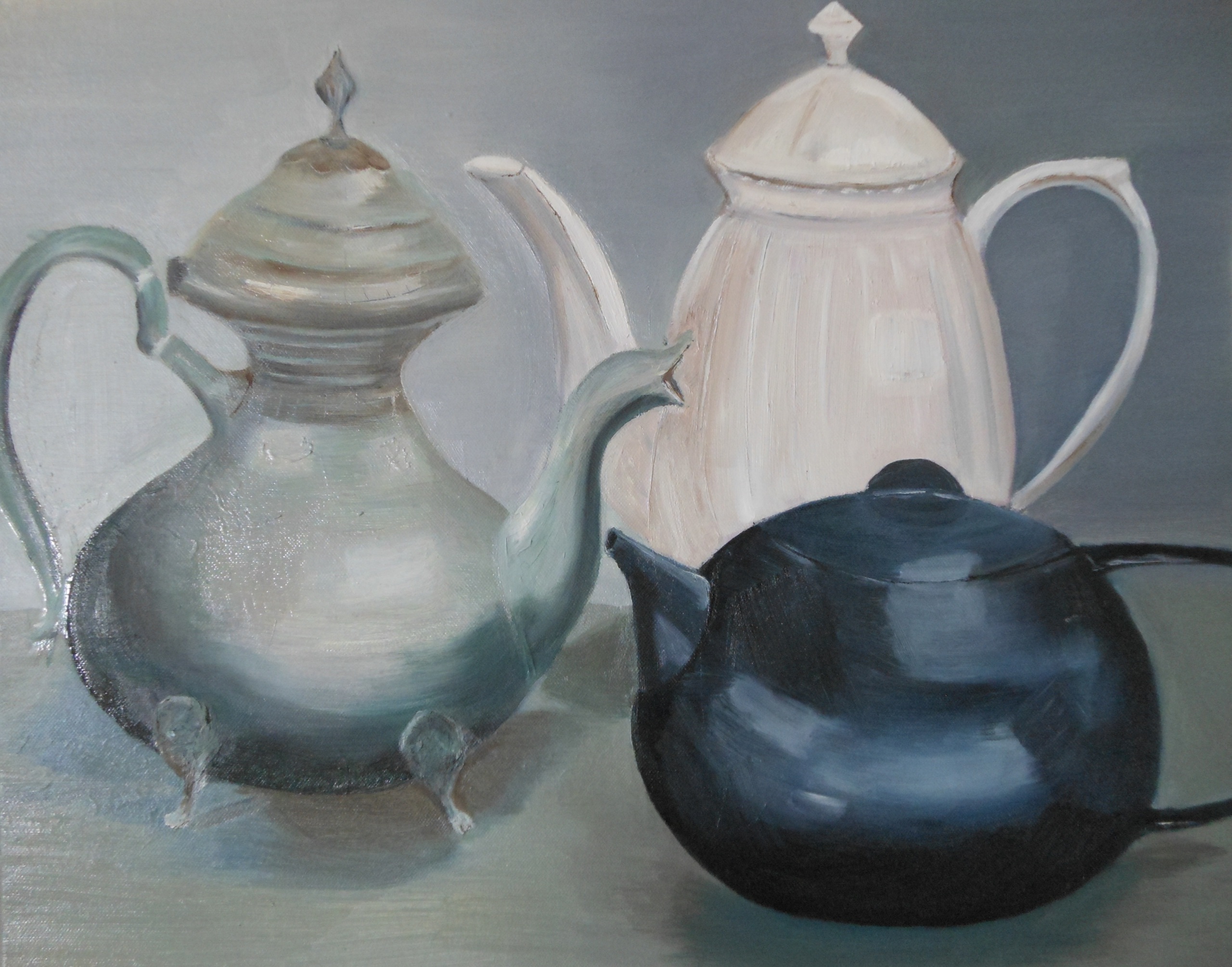 Drie theepotten in drie stijlen in olieverf Dit werk zit in een zwarte baklijst met zilverkleurige voorkant