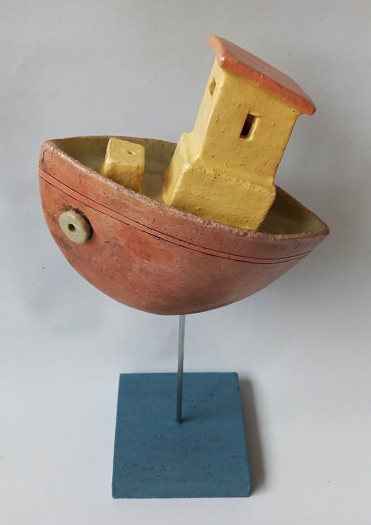 Rode Van Klei Op Met Een En De Het Bootje Golven Varen Voetje Hoog Geplaatst Te Geglazuurd Gedeeltelijk Waardoor Lijkt Kleislib Geleurd