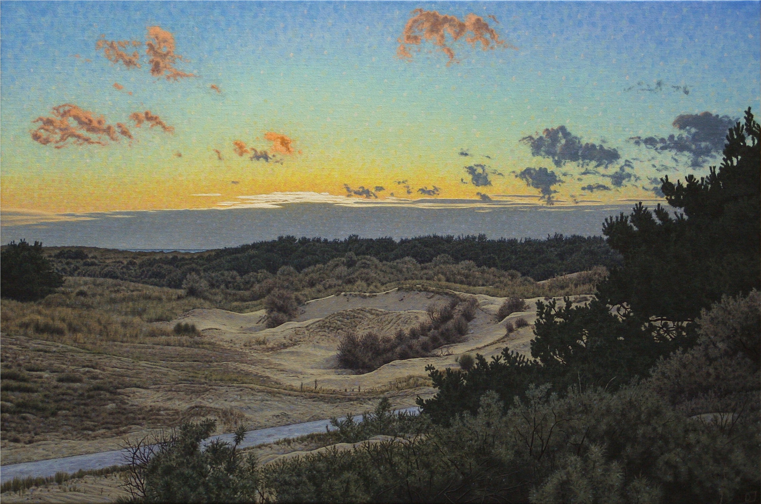 Uitzicht over de duinen te noorden van Noordwijk tijdens de schemering op midzomerdag.