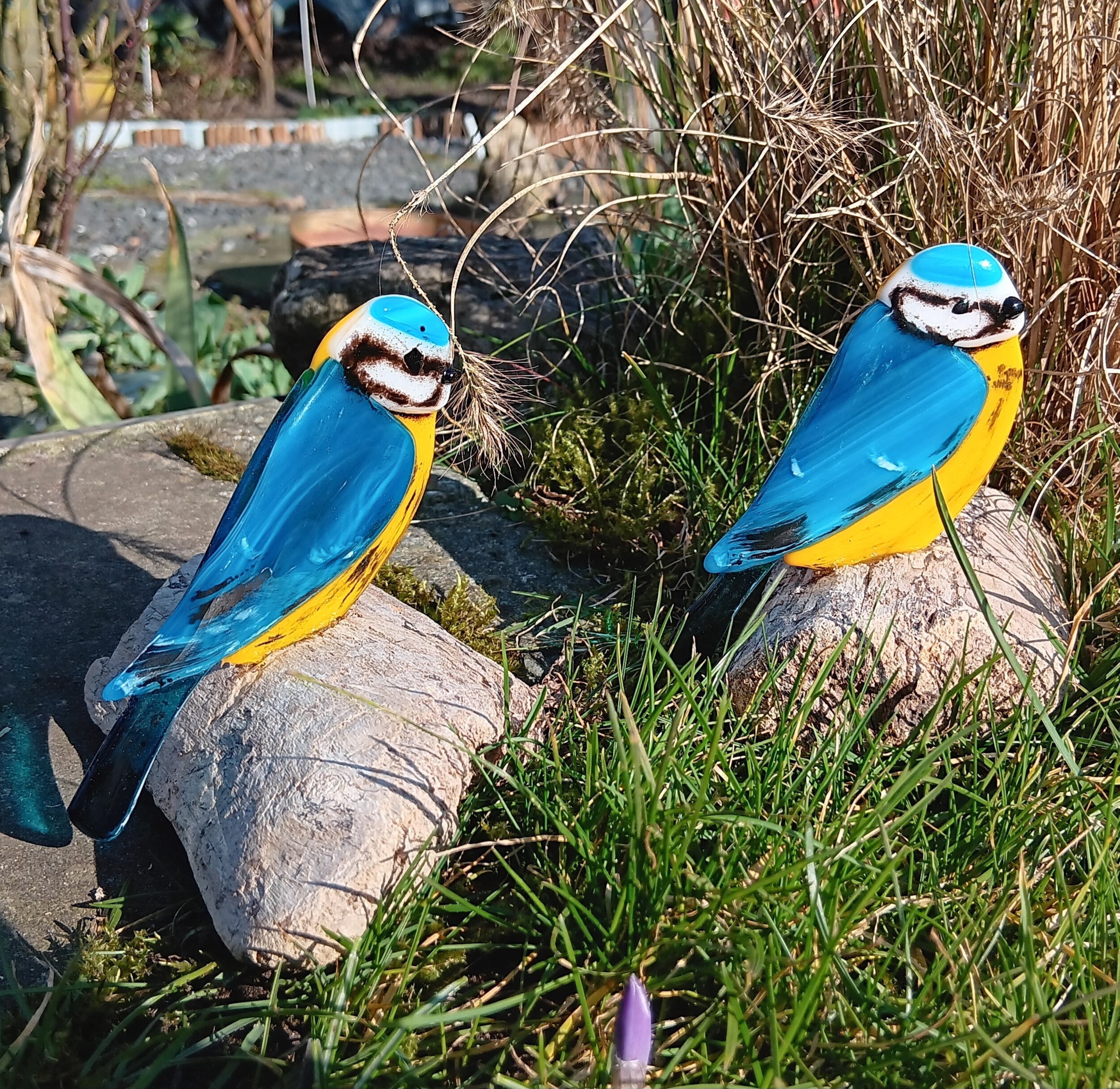 Beryl en Bob Bluetit - een beetje glasfusie, brandschilderij en drijfhout. Verbluffend resultaat.