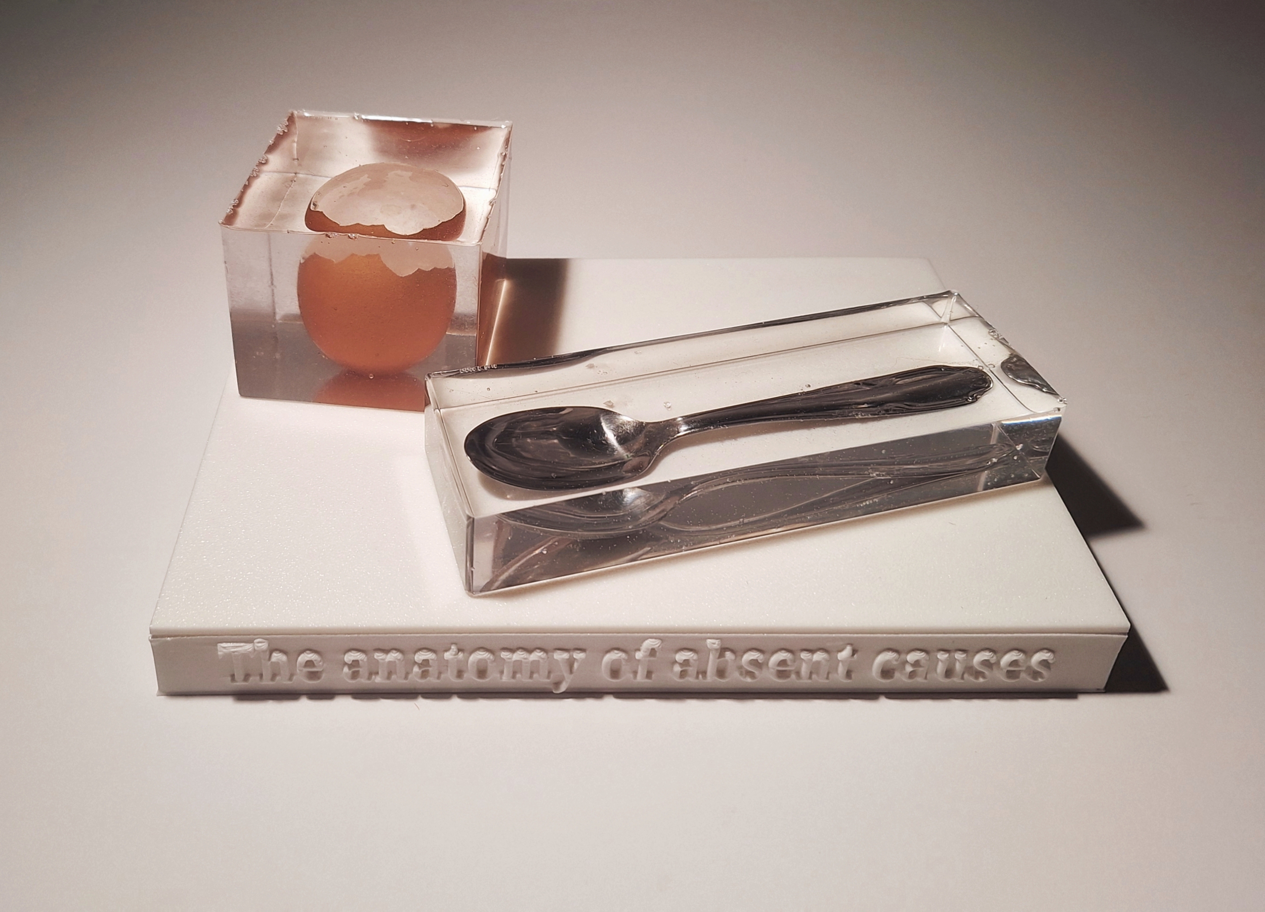 The Anatomy of Absent Causes is an installation that examines our innate tendency to construct causal narratives from fragmentary observations. Even when no action or event is shown, we instinctively fill the void with a story that imposes order and meaning. This work makes that cognitive reflex both visible and tangible. On a white plinth, with the title embossed along the front, sit two transparent cast-resin blocks. One contains a cracked eggshell, positioned with the precision of a scientific specimen. The other encases a metal spoon, equally stripped of context and functionality. Through this act of preservation, the objects are presented as archival evidence, removed from any timeline or event that could connect them. By freezing the objects in time, the installation intensifies its conceptual aim: the viewer encounters only the aftermath, never the cause. The mind seizes this absence and constructs a plausible narrative — a process that the Scottish philosopher David Hume described as a habit of the mind rather than a property of the world. The work exposes this automatic projection: we interpret, connect, and reconstruct even when factual linkage is missing. The installation invites a slower gaze and encourages self-awareness: what do we truly perceive, and what do we mentally supply?