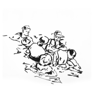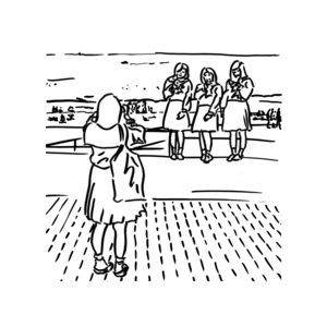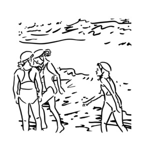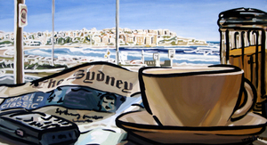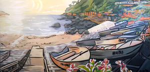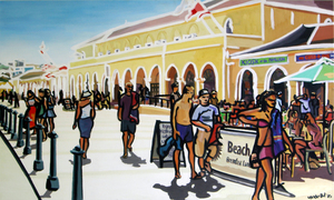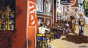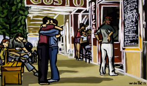 Weergeving van sociaal en cultureel unieke momenten in een grafisch beinvloede schilderstijl, olieverf op doek.