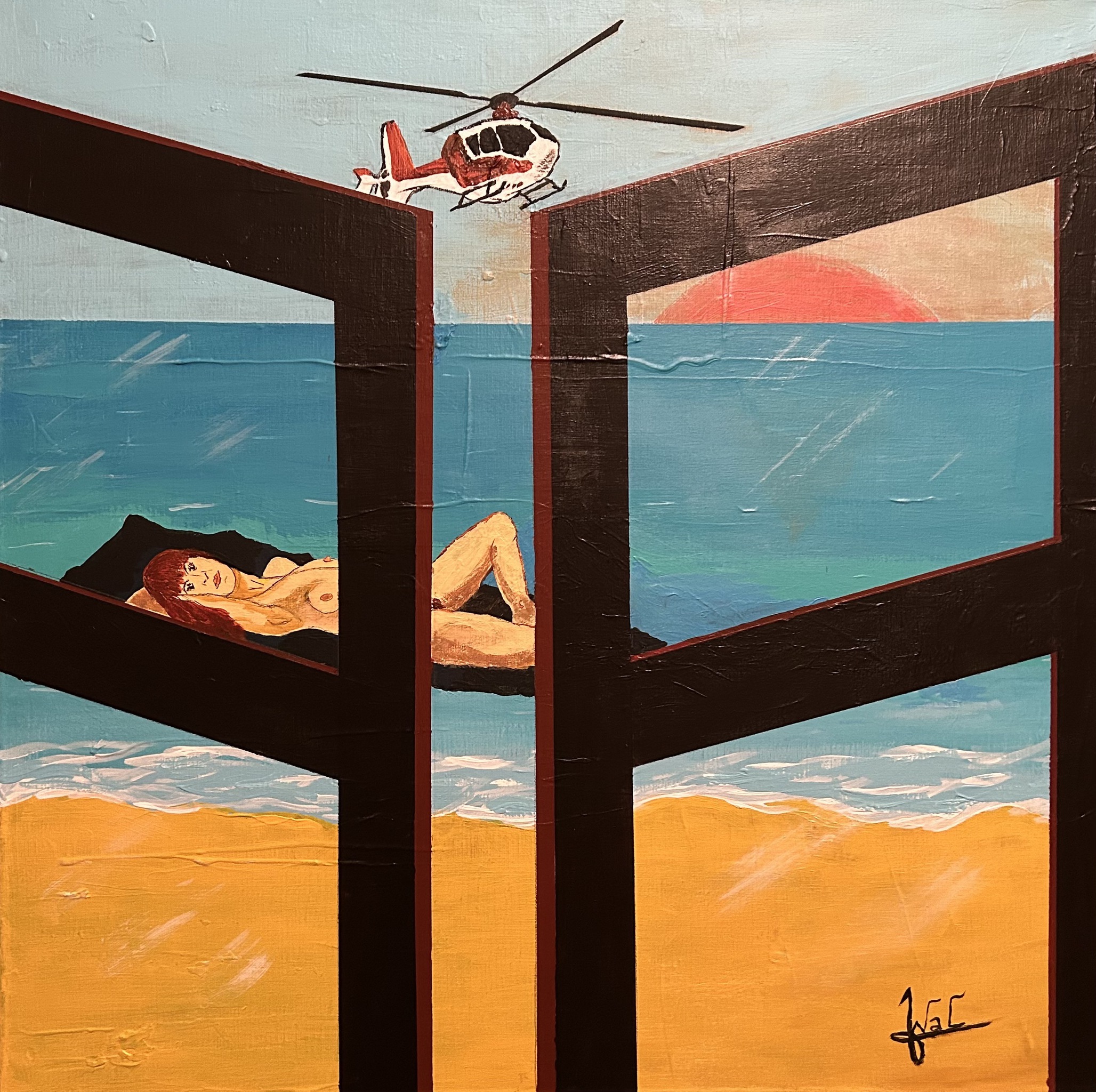 Ik schilder met acryl op doek met soms architectonische achtergronden. Met de menselijke figuren die ik erin aanbreng (geschilderd of als collage) probeer ik een verhaal te vertellen.