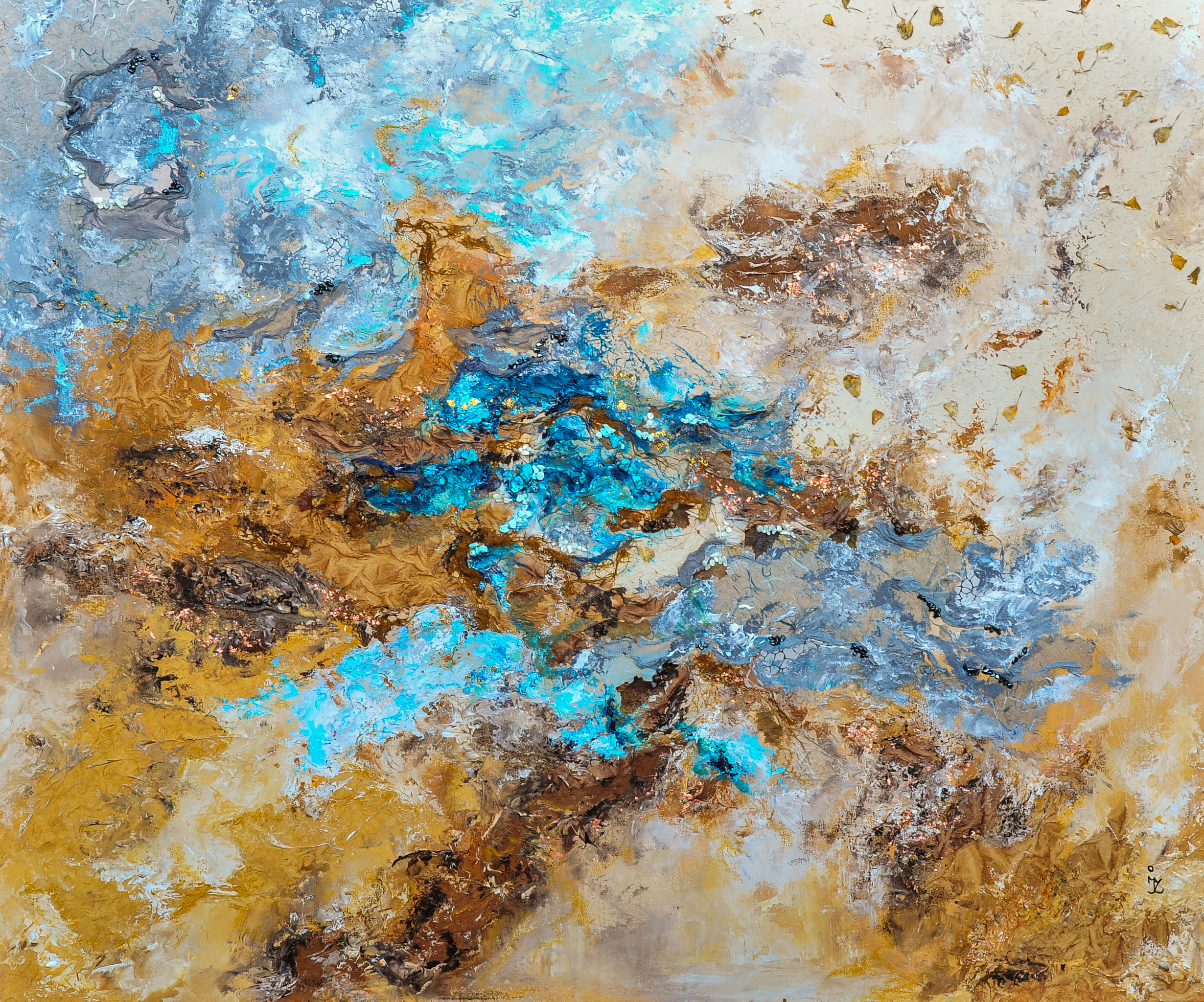 Acryl op doek, gemengde techniek met turkoois, hematiet, zirkoon en parelmoer.