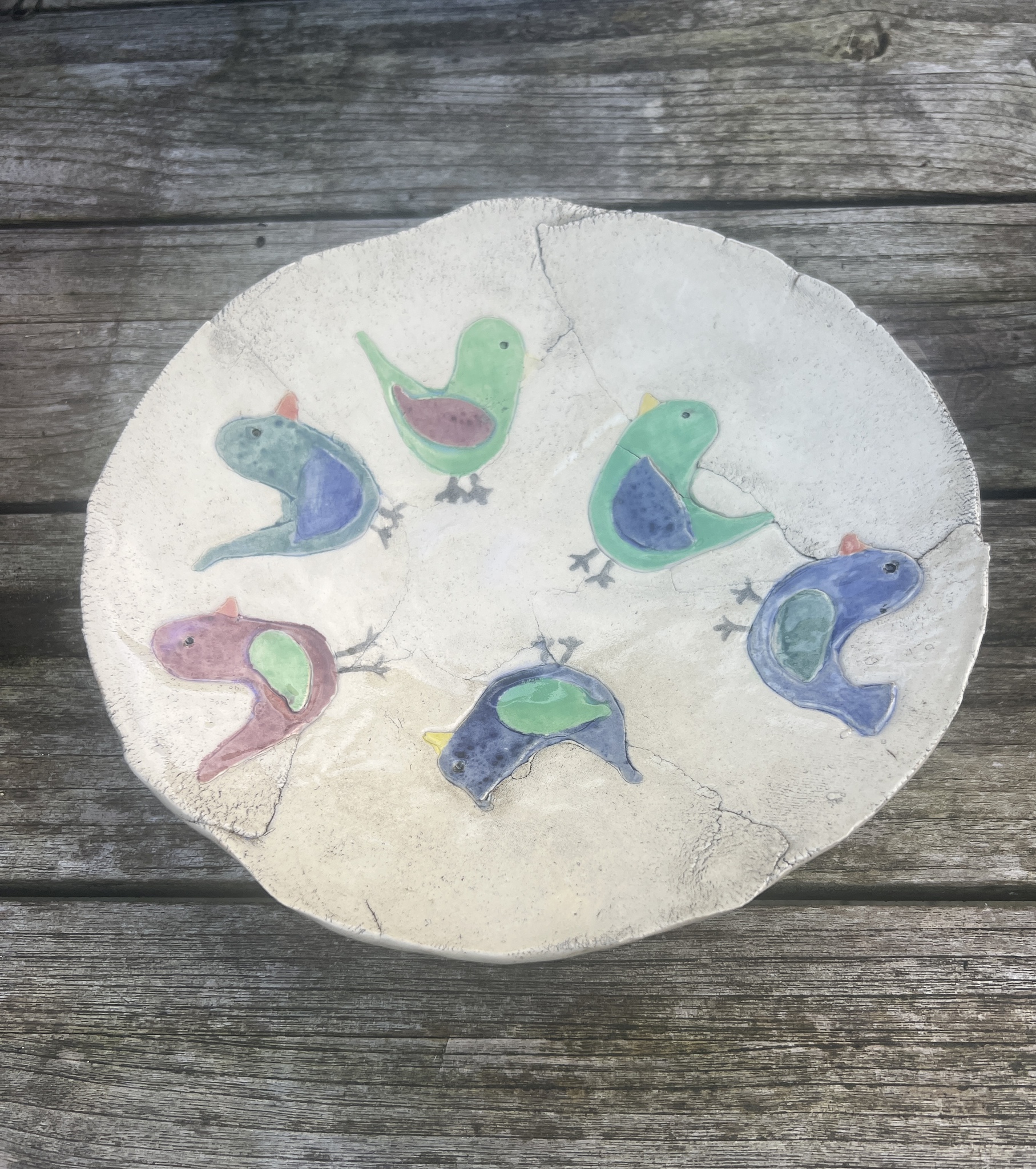 Blauw Vogel Dieren Kleuren Kleurrijk Tuin Schaal Handgemaakt Kunst Vrolijk Uniek Vogels Voor Keramiek Steengoed Handmade Waterschaal Buitenkunst Vogelschaal