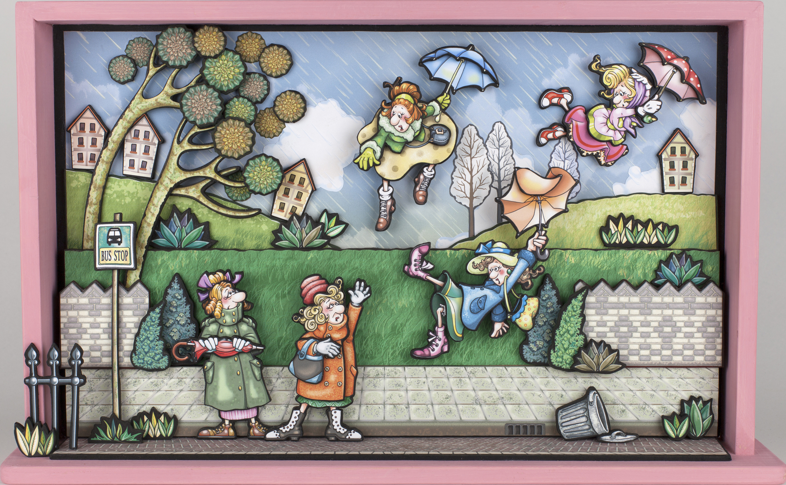 Het liefst maak ik verhalende tekeningen met wat humor, geplaatst in drie-dimensionale houten kistjes. Maar ook beeldhouwwerk, keramiek en textiel. Altijd figuratief met veel details.
