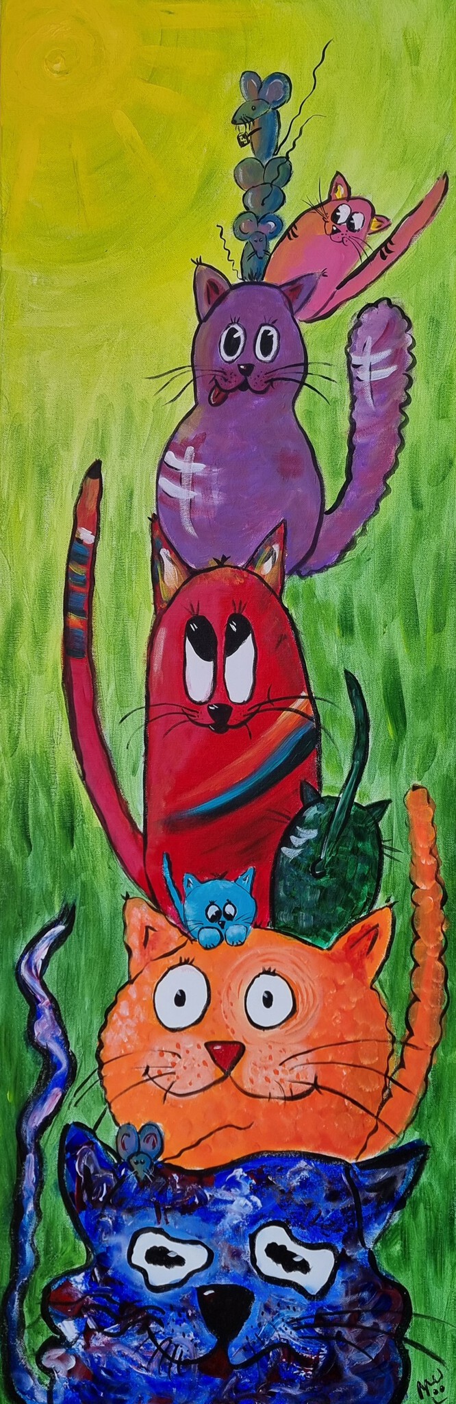 Poezen en muizen in een onmogelijke stapel, gekker kan het niet worden.
