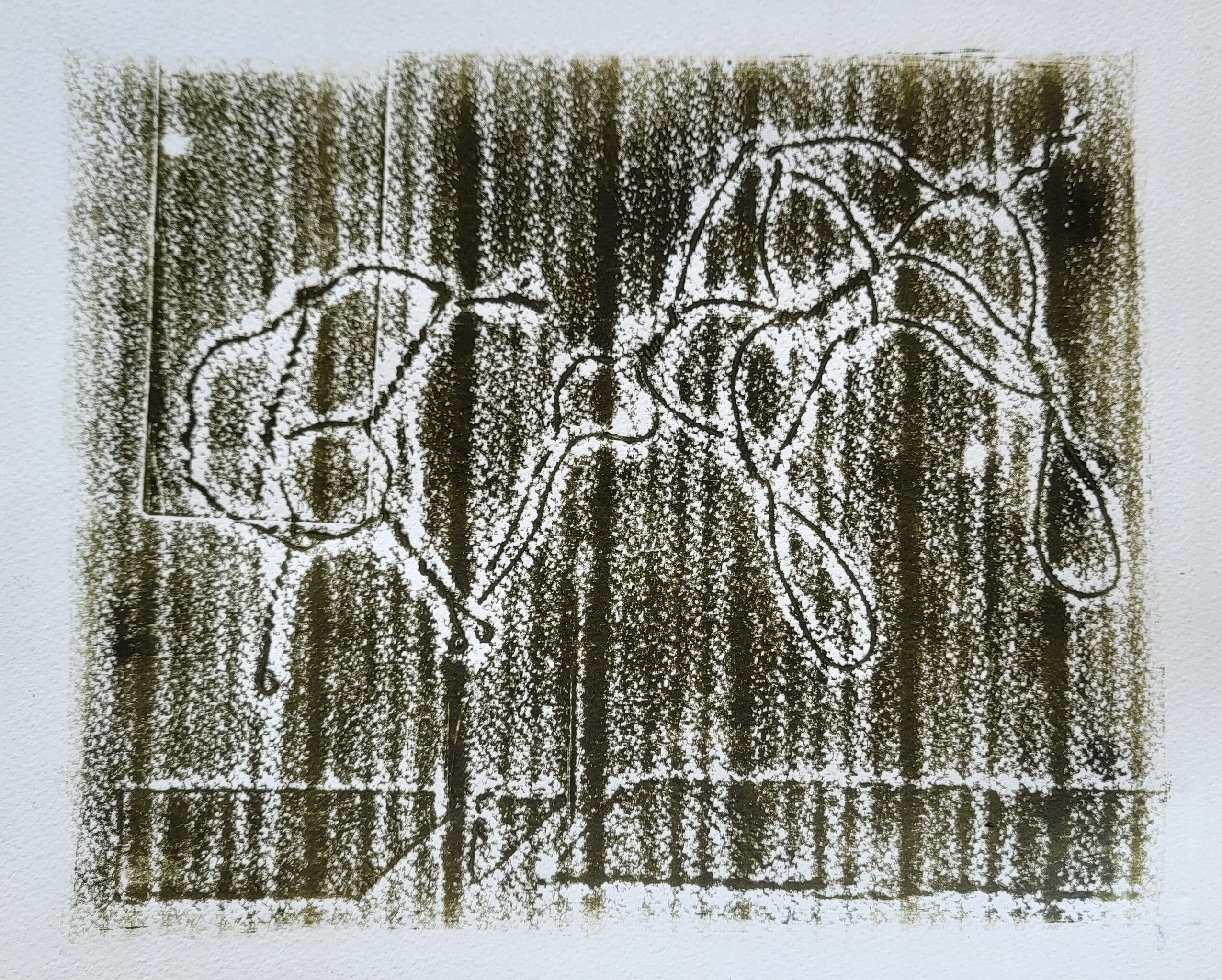 Woorden zijn gaan strijden met betekenis, / posities worden grillig ingenomen / en ontkenning is het / nieuwe geloof geworden. // Druk nu de ‘reset button'. (druk-monoprint)