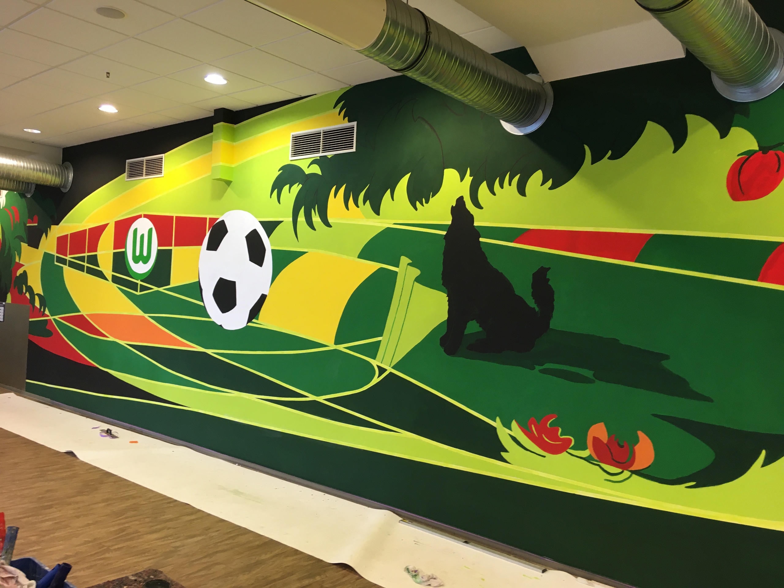Wandschildering in het restaurant van het Wolfsburgstadion.