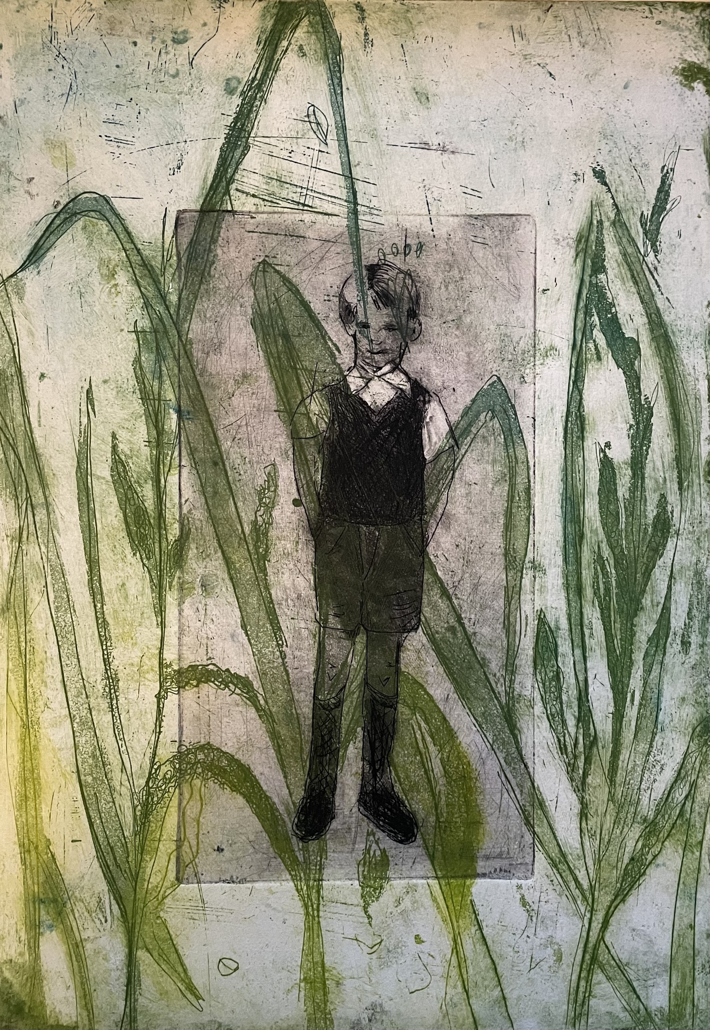 Ets compositie van een droge naald ets en van een aquatint ets , gedrukt over een ecoprint.Vrijheid in de Friese natuur, vrijheid en verbondenheid, over mijn wortels in Friesland.