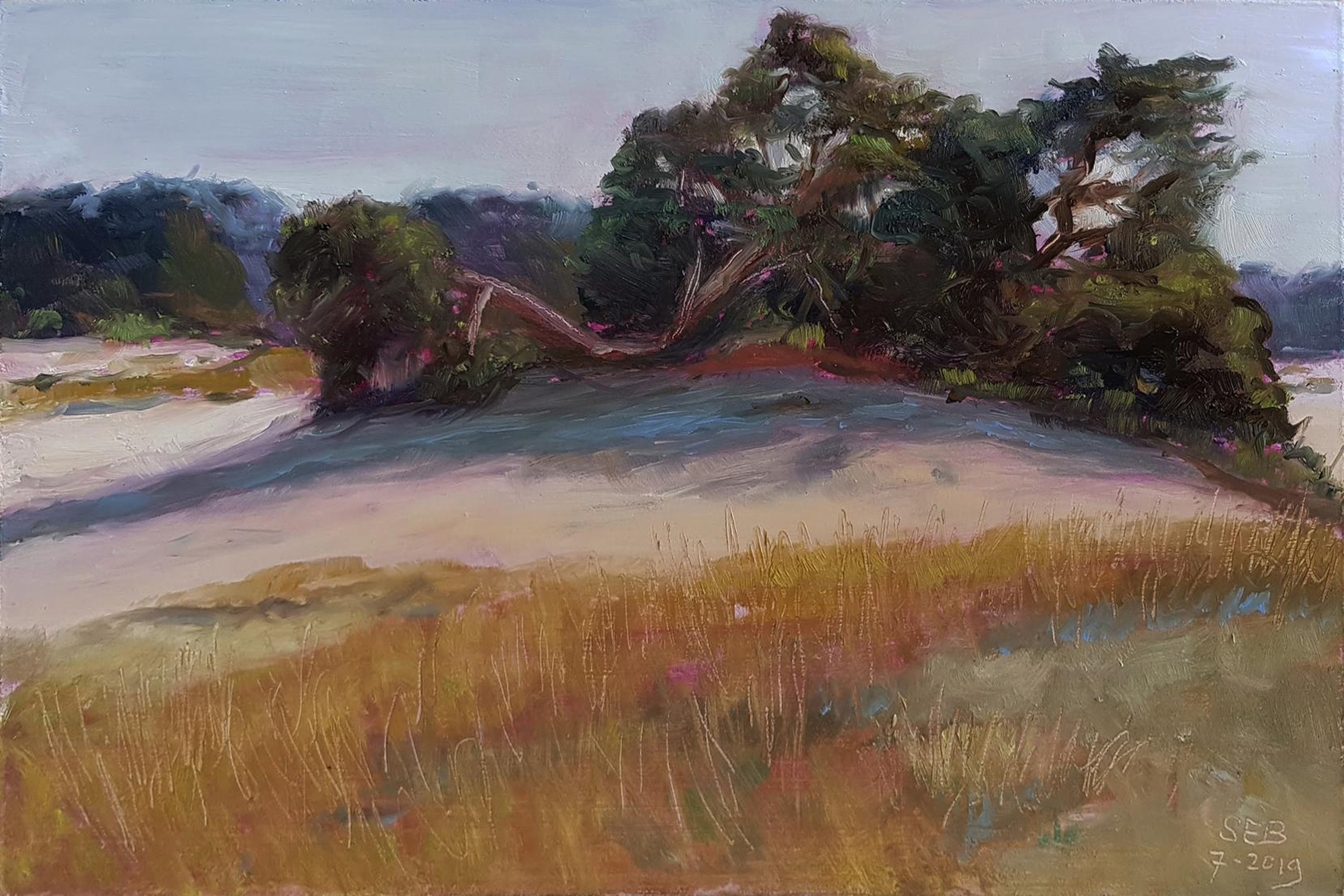 Een olieverflandschap op hardboard, 20 x 31 cm. Geschilderd in de vroege ochtend van vrijdag 26 juli 2019, nabij de uitkijktoren. Voorzien van een ophangsysteem en zwarthouten lijst. VERKOCHT