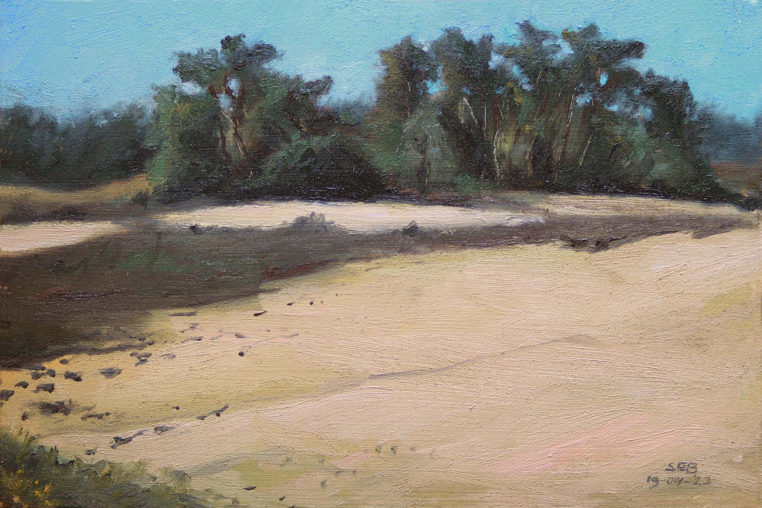 Een olieverflandschap op 4mm MDF, 20 x 30 cm. En plein air op het Kootwijkerzand, op woensdagmiddag 19 april 2023. Voorzien van een ophangsysteem en zwarthouten lijst.