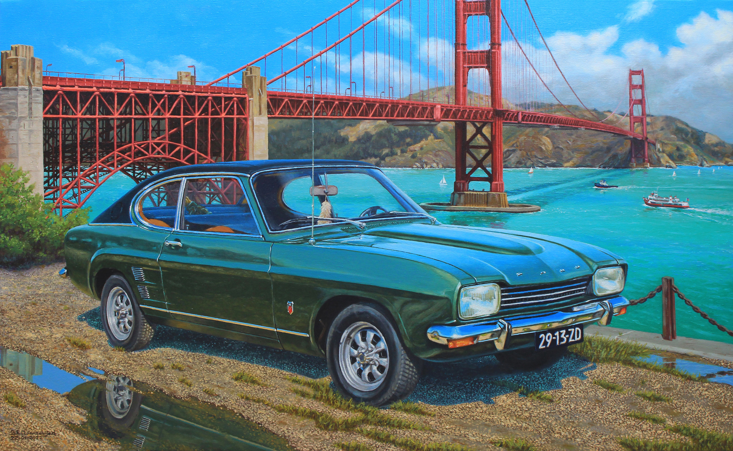Een portret in opdracht van een Ford Capri uit 1973. De auto moest geplaatst worden tegen de achtergrond van de Golden Gate Bridge in San Fransisco (VS). Alles in deze compositie is volgens de Gulden Snede verdeeld: Hoogte/breedte doek, hoogte horizon, pijlers brug, plas water, plaats van de auto, en de lijst gaat maar door... Olieverf op linnen, 80 x 130 cm, 22 januari 2022. VERKOCHT.