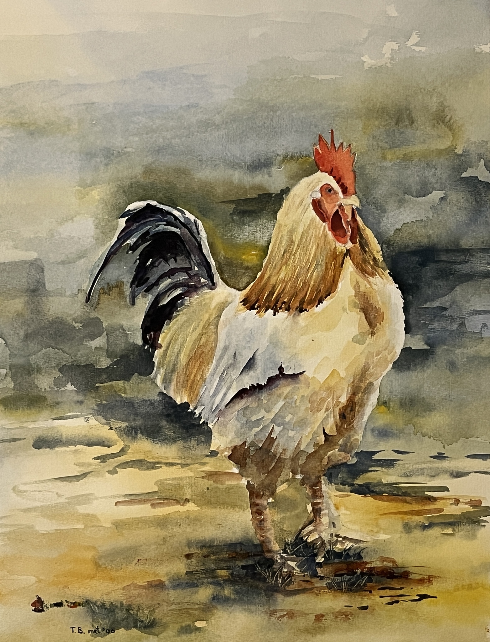 Deze trotse haan is een aquarelschilderij inclusief passepartout en professionele aluminium wissellijst.
