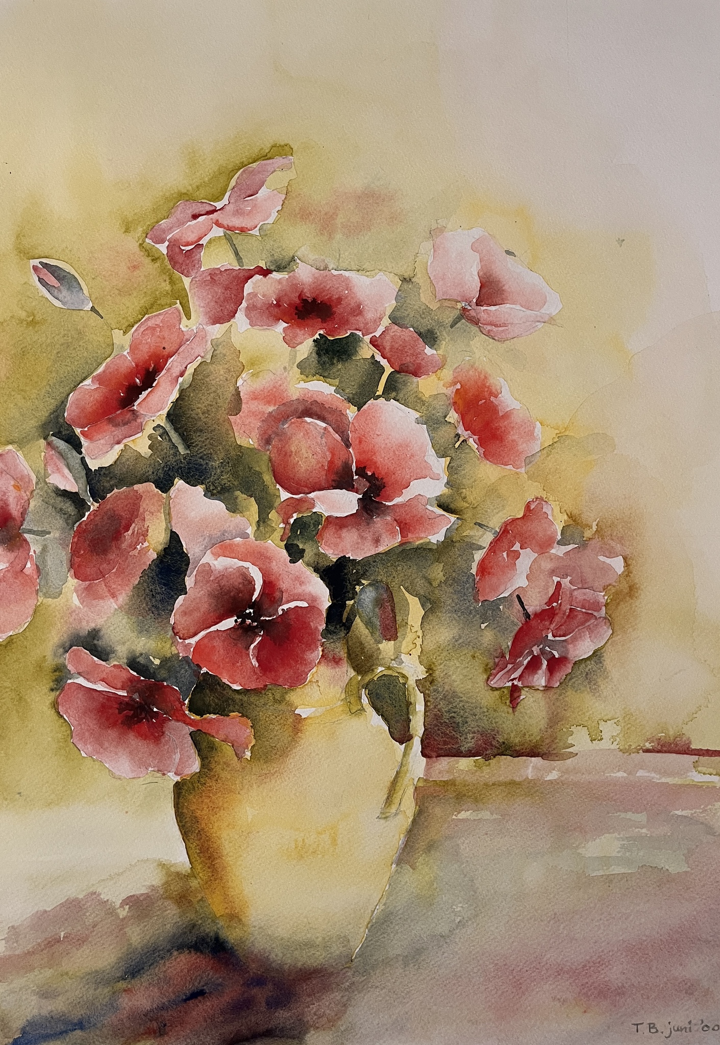 Klaprozen, is een aquarelschilderij inclusief passepartout en professionele aluminium wissellijst.