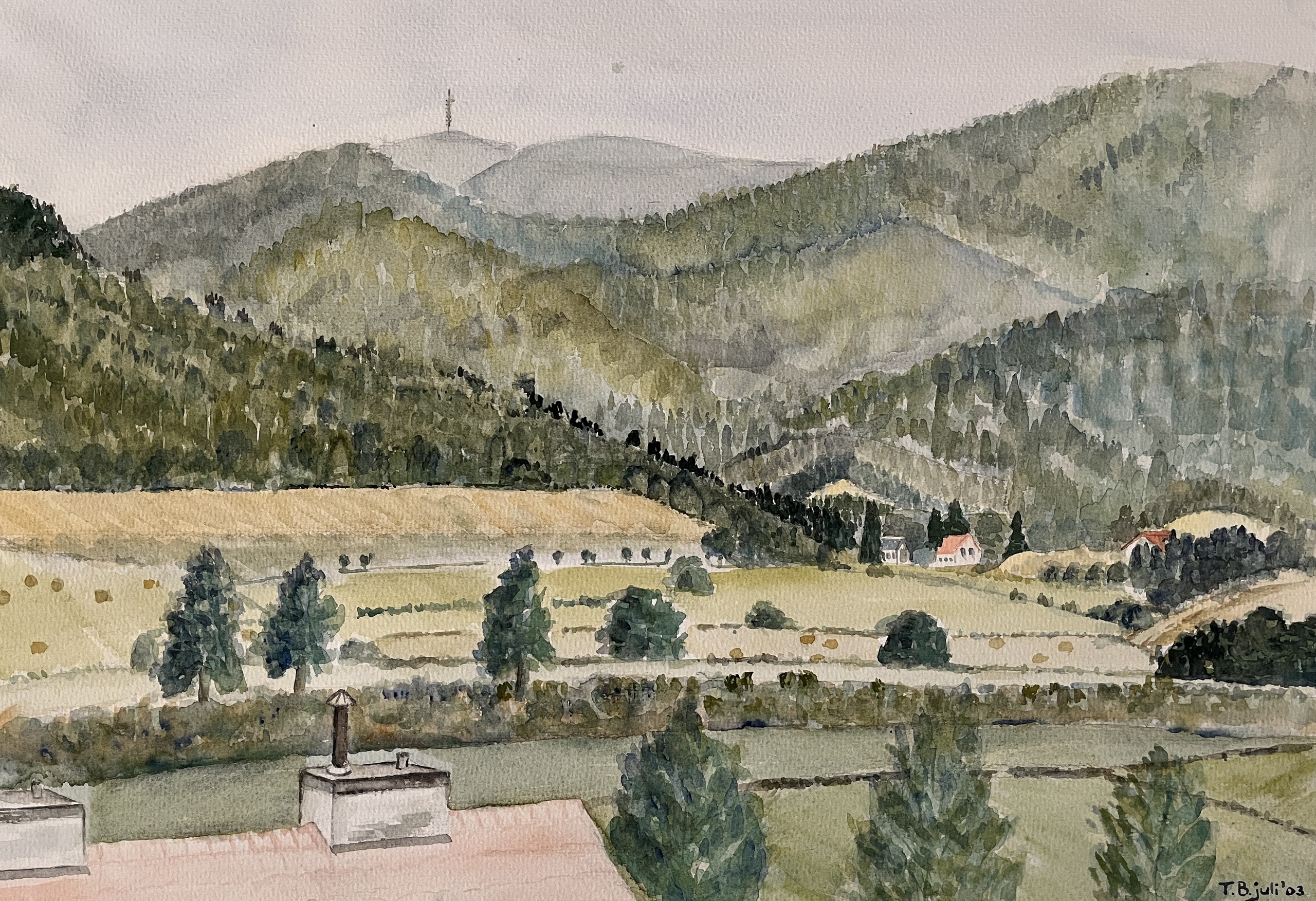 Op vakantie in Sauerland maakte ik dit uitzicht vanuit ons huisje. Het is een aquarelschilderij inclusief passepartout en professionele aluminium wissellijst.