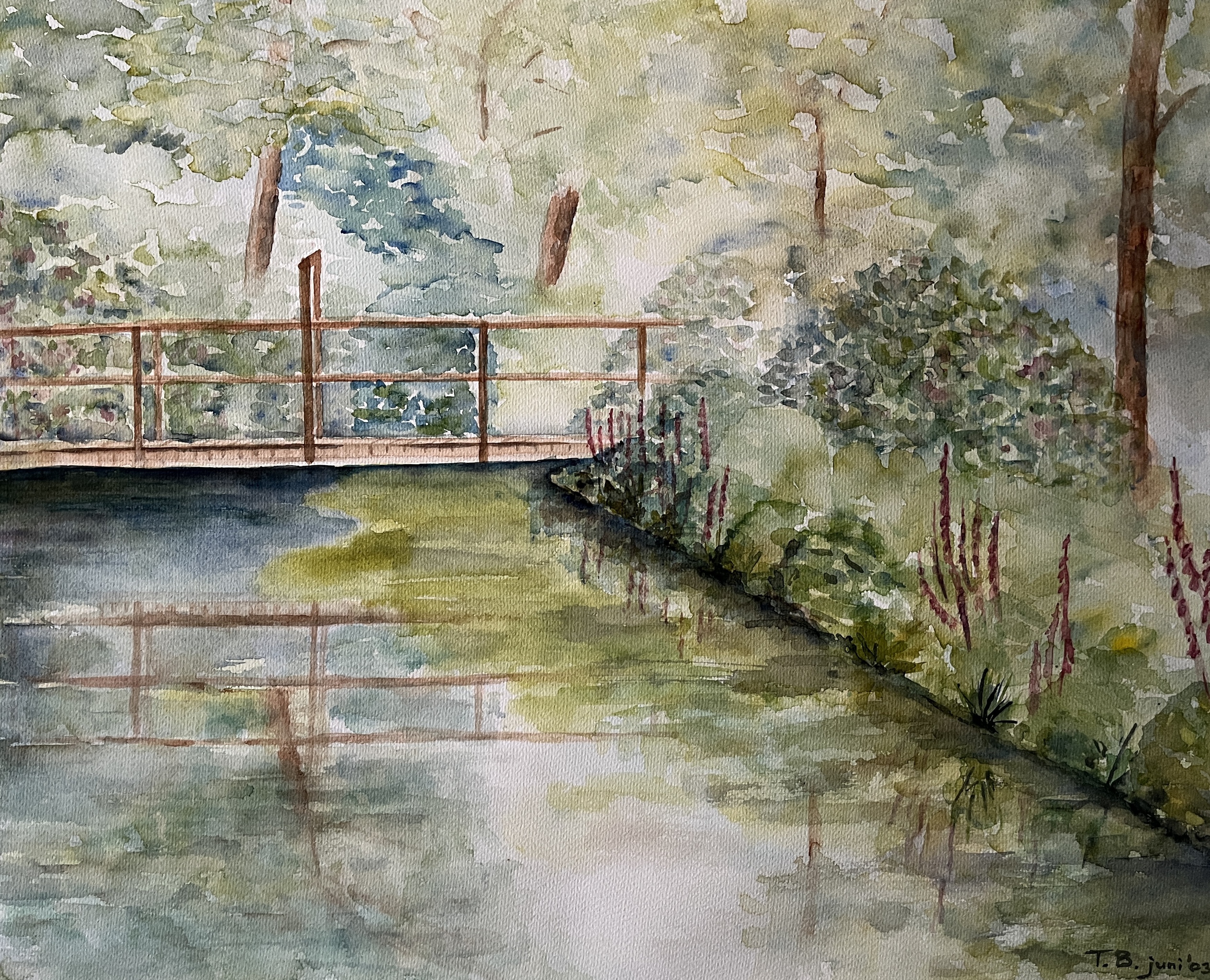Dit bruggetje over het water was omgeven door rododendrons, heerlijk voorjaargevoel. Dit is een aquarelschilderij inclusief passepartout en professionele aluminium wissellijst.
