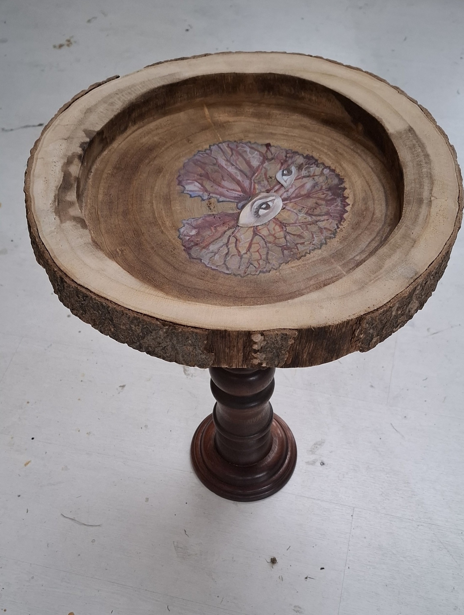 Een boomschijf met daarin een eitempera blad, waaruit 2 ogen kijken.