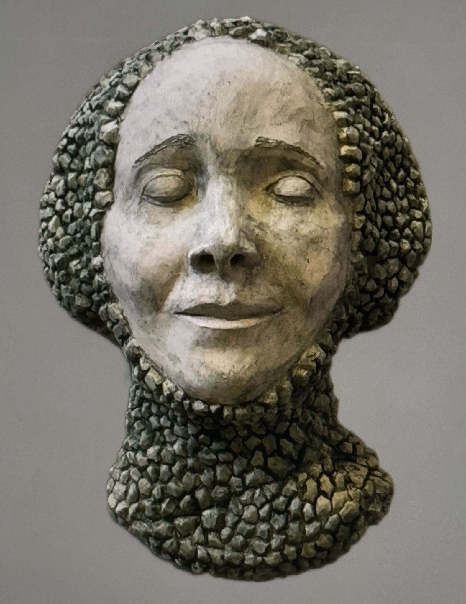 Steengoed gebakken wandportret met oxiden bewerkt en transparant geglazuurd, voor binnen of buiten aan de muur