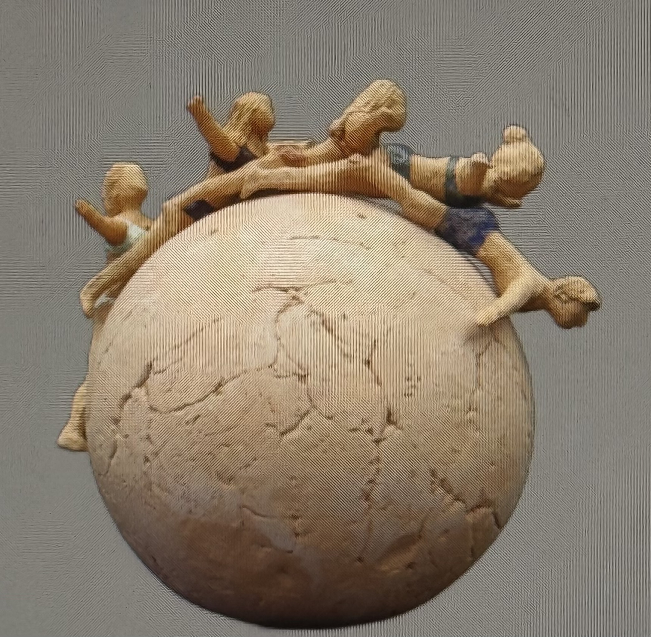 Steengoed gebakken firguurtjes op wereldbol in badkleding duikend naar de vrijheid